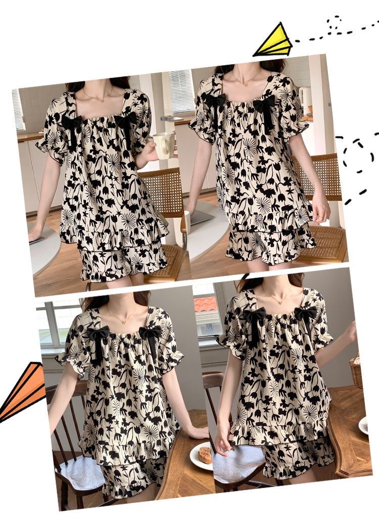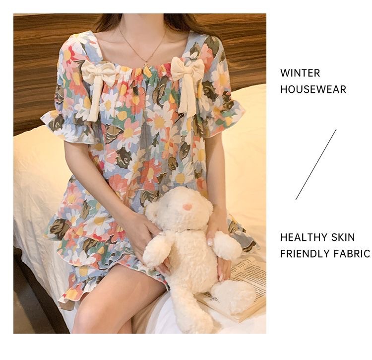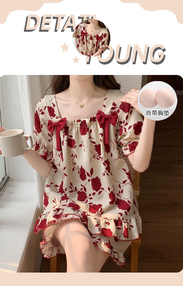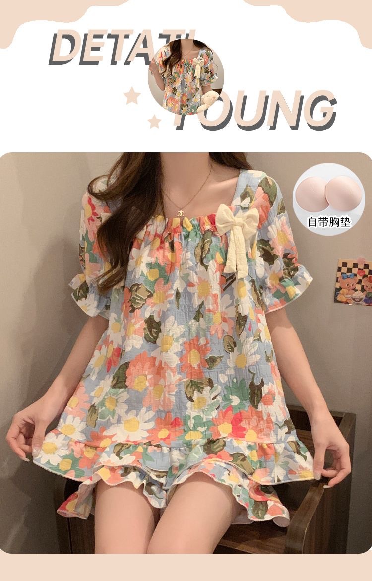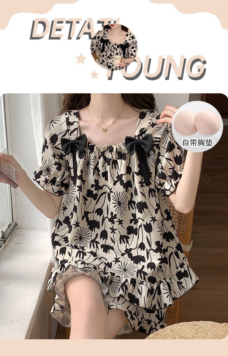 睡裙女夏季睡衣短袖带胸垫薄款可爱花朵宽松新款可外穿夏天家居服