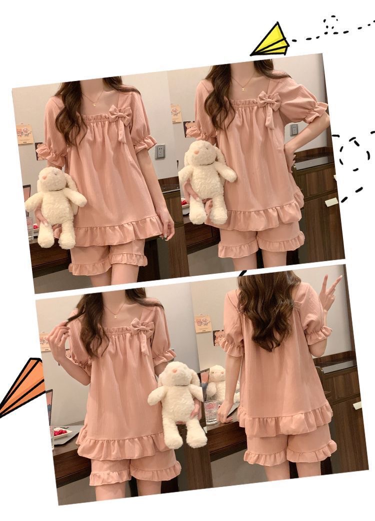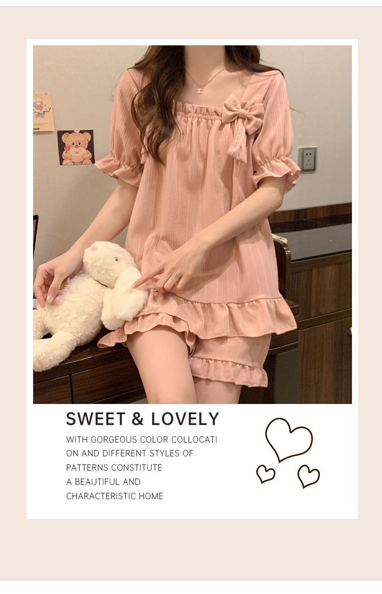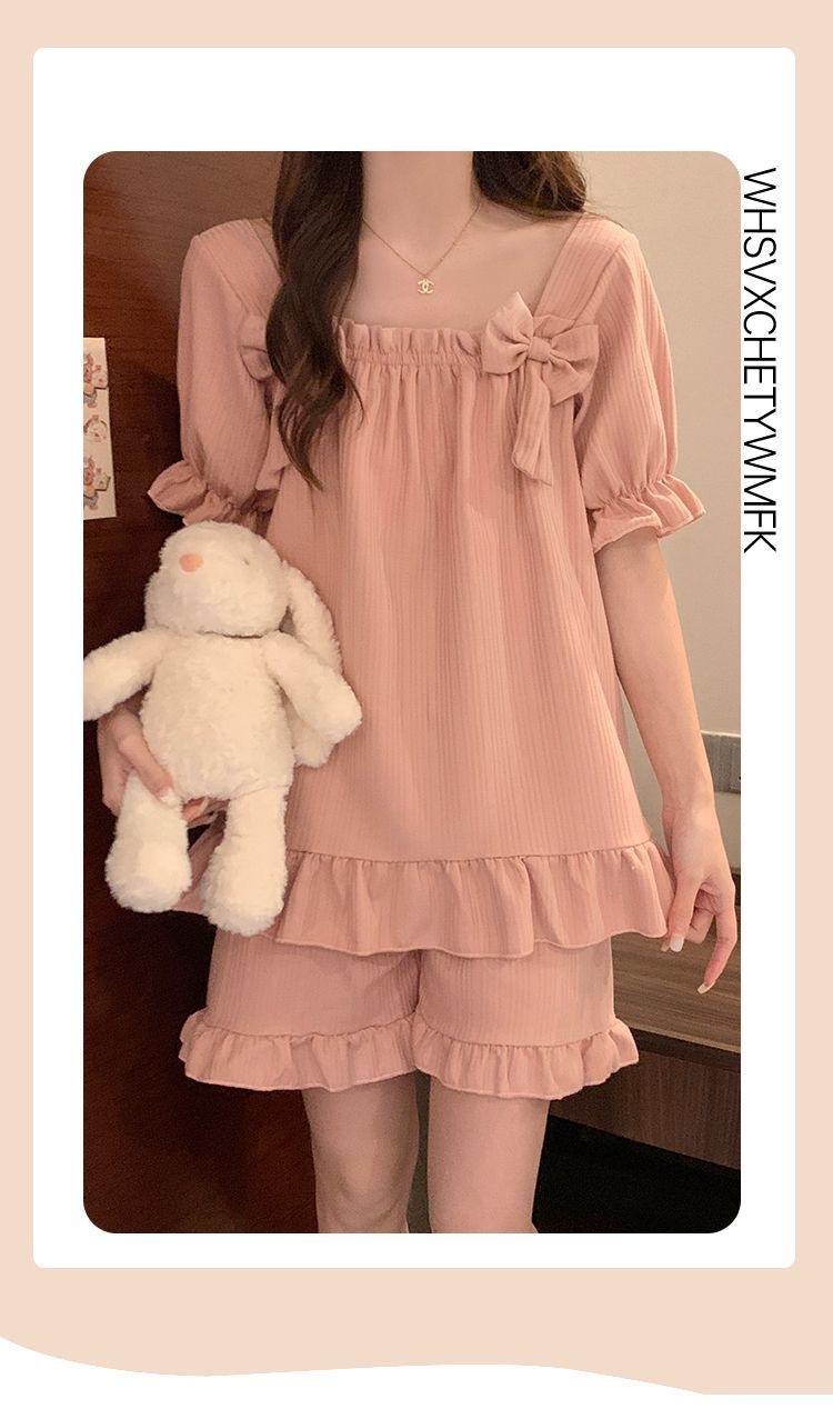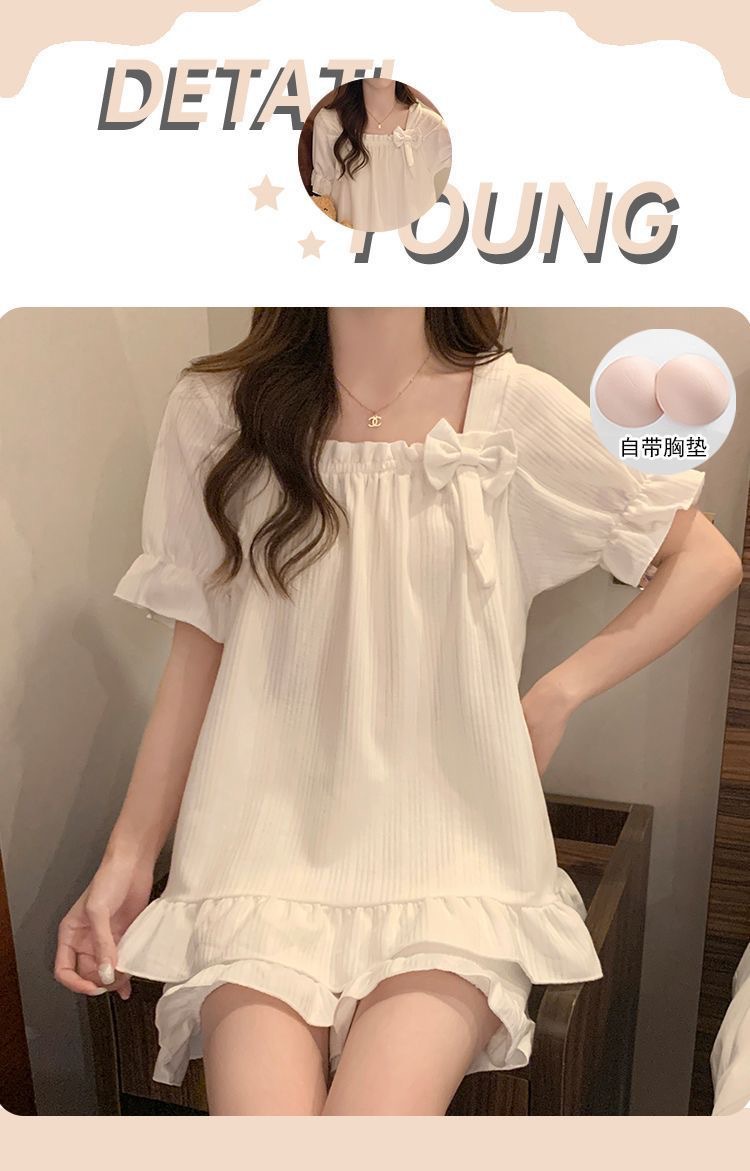 女性用胸パッド付きパジャマ、夏用半袖薄手の膨らみ防止かわいいリボン甘いサマースーツホーム服