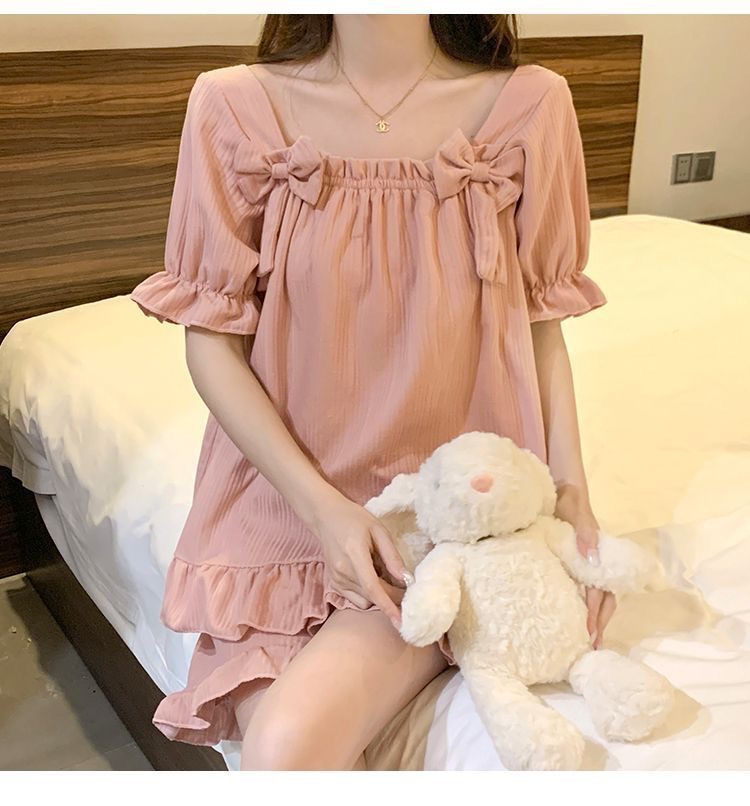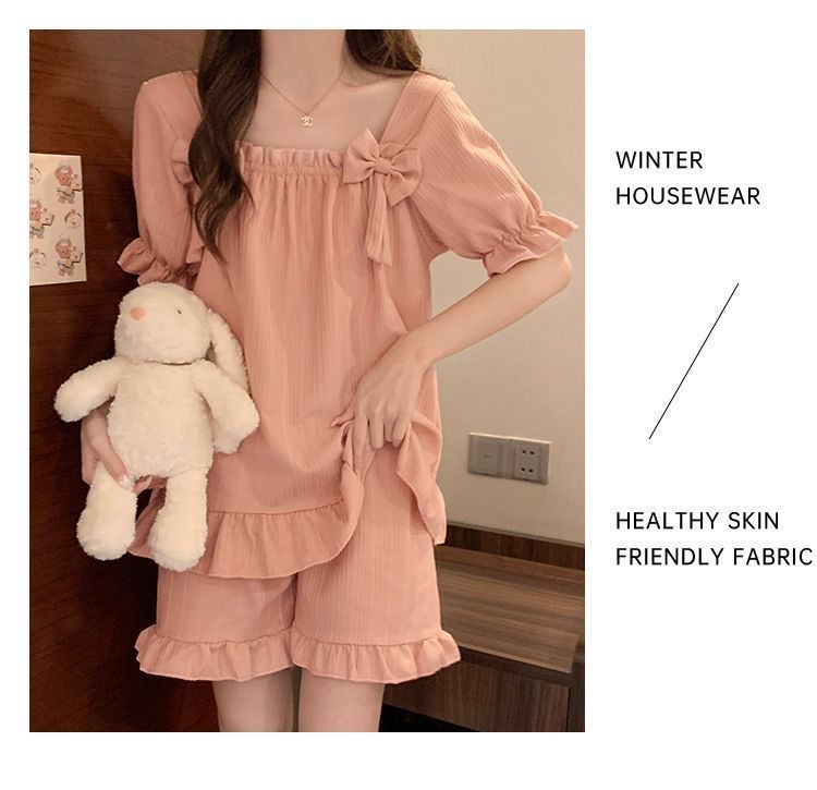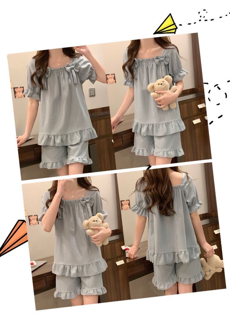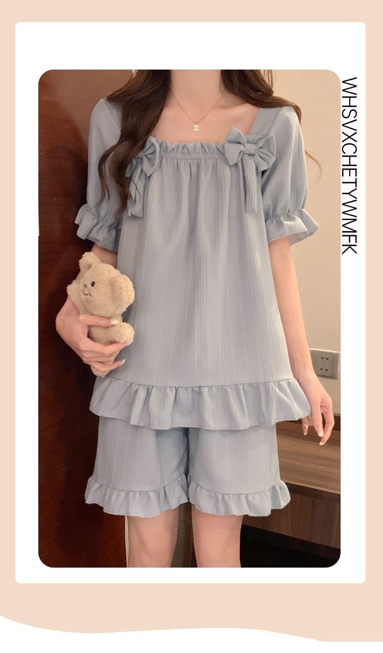 女性用胸パッド付きパジャマ、夏用半袖薄手の膨らみ防止かわいいリボン甘いサマースーツホーム服