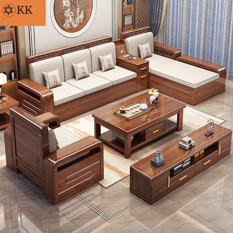 新しい中国風のリビングルームの収納シンプルでモダンな小さなアパート木製経済的な家具ウォールナット全無垢材ソファの組み合わせ