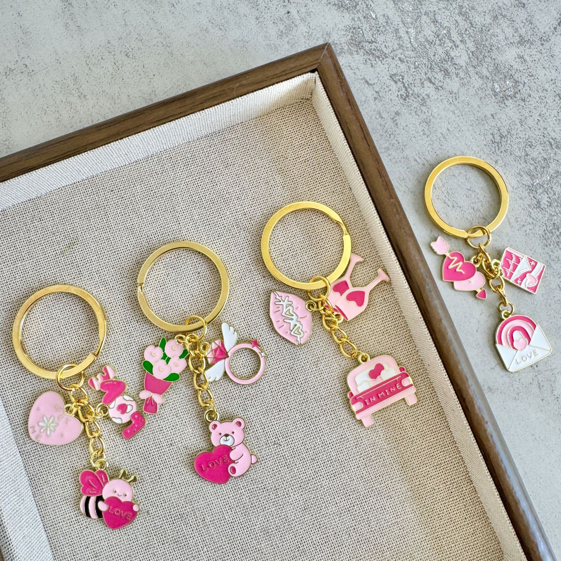 粉色爱心情人节钥匙扣套装卡通多件挂饰小熊蜜蜂花束情侣挂件批发