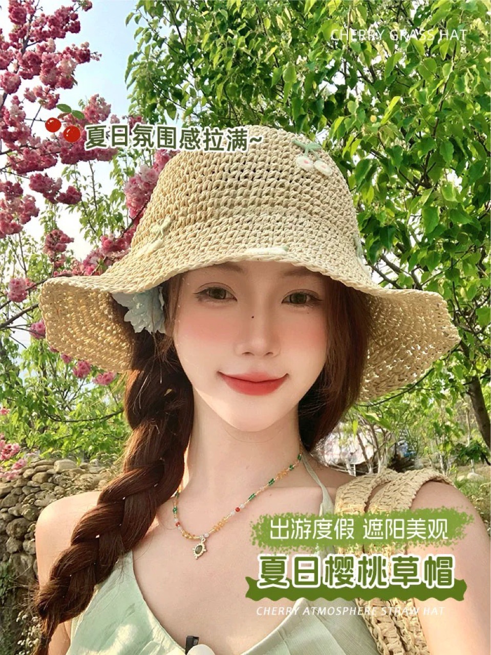 夏季海边沙滩度假风拍照花朵大帽檐草帽女简约遮阳防晒帽子潮