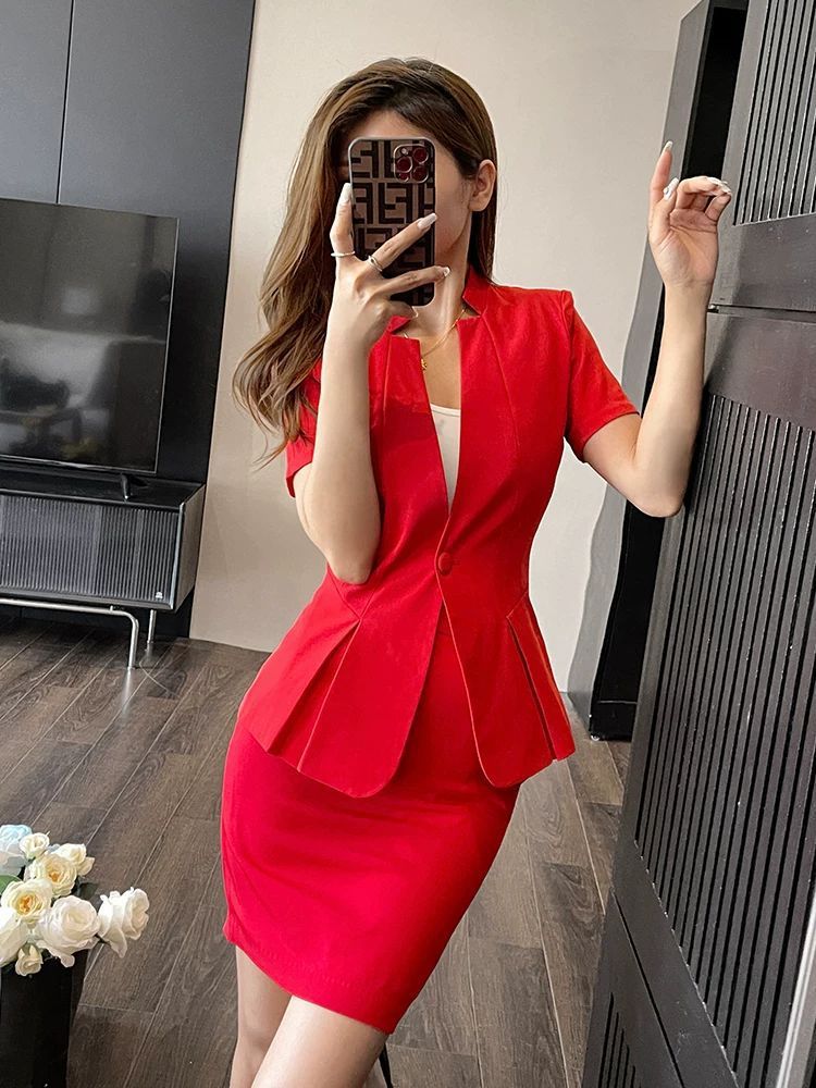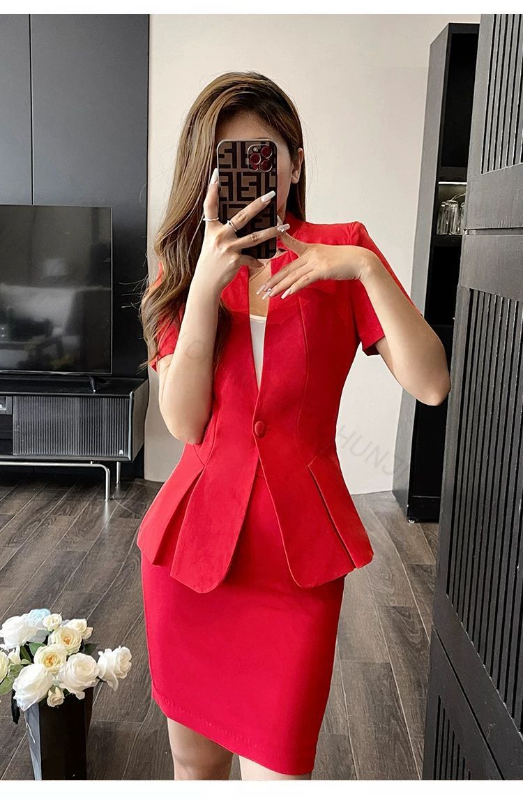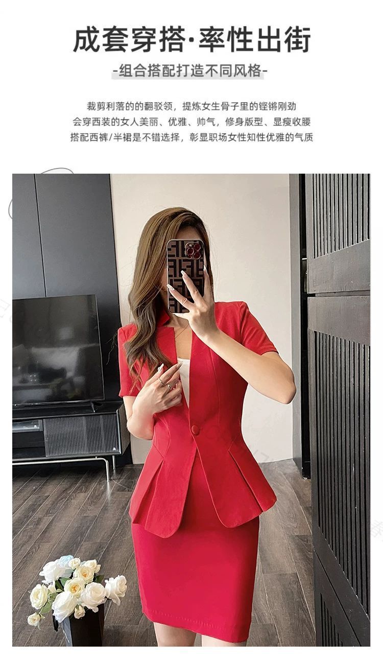 颜色 浅灰色短袖西装,黑色短袖西装,红色短袖西装,红色西装+西裙,黑色西装+西裙,浅灰色西装+西裙,红色半身裙,浅灰色半身裙,黑色半身裙
