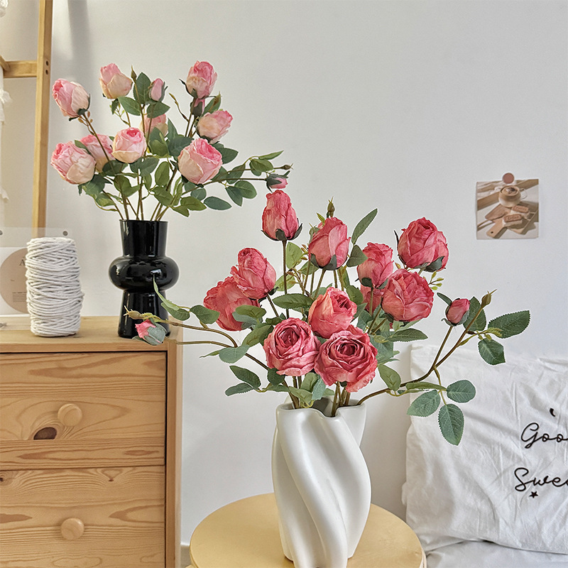 フランスの造花単一枝 3 ヘッドバーントエッジローズレトロホームリビングルームの装飾造花ドライフラワーブーケハイエンド