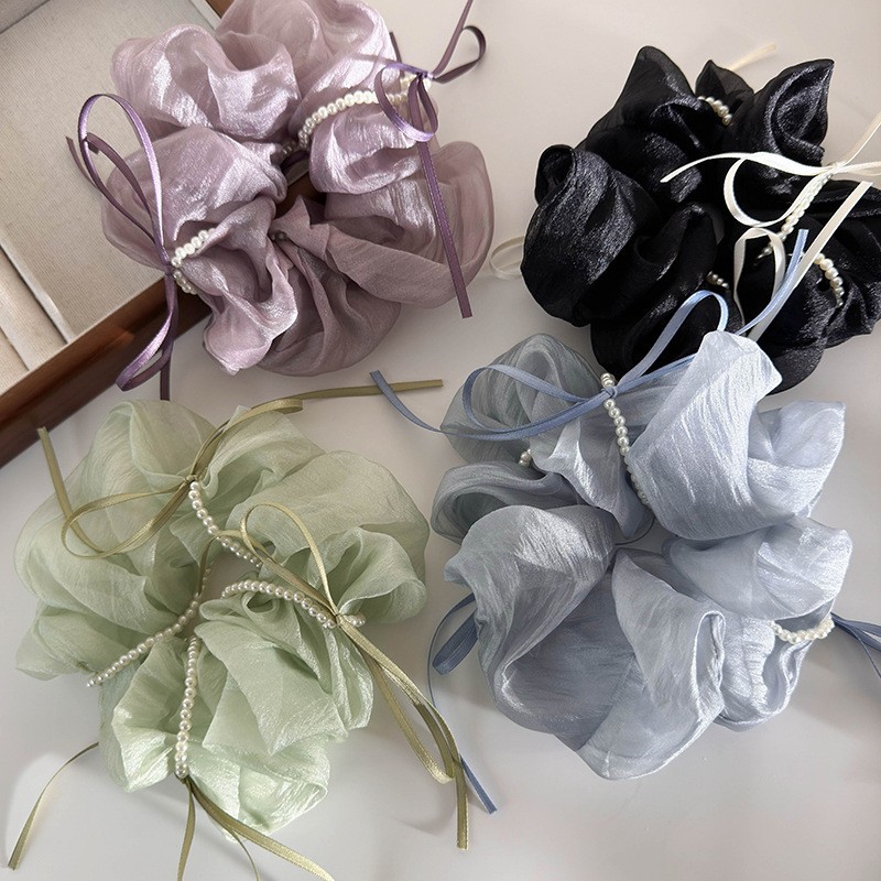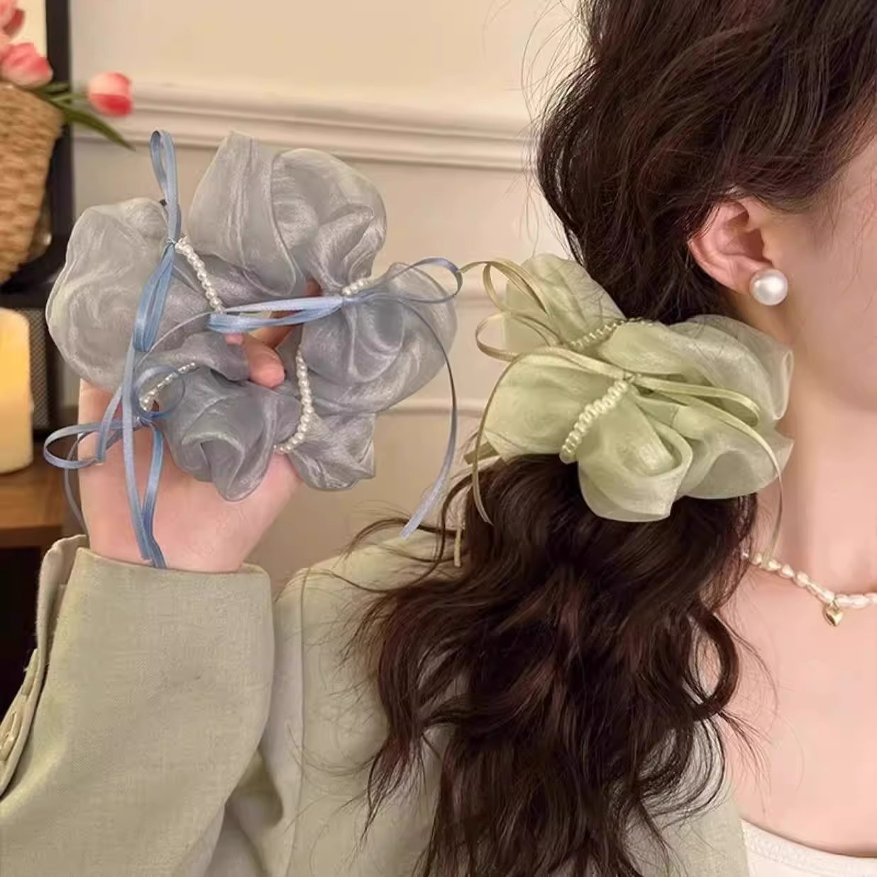 韓国版イン夏新作パールリボンリボンガーゼサテンヘアゴム優しい妖精ヘアロープヘアアクセサリー