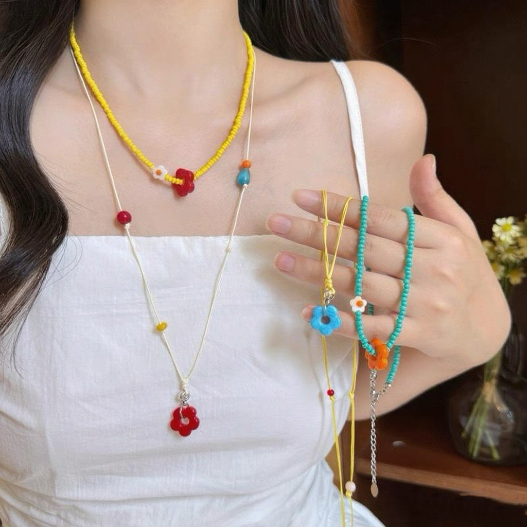 夏日多巴胺小花串珠项链女款新款爆款长款甜美挂脖卫衣链配饰