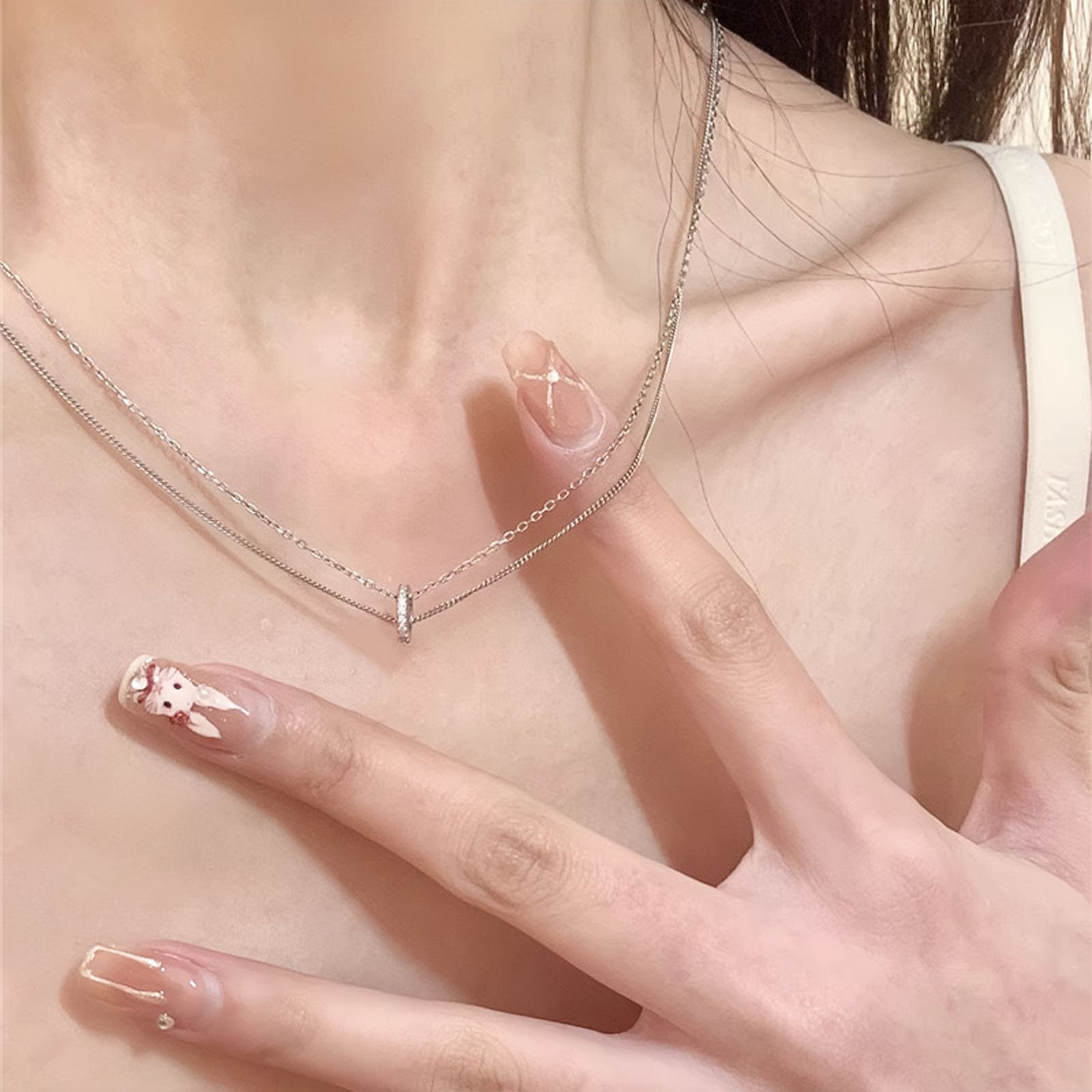 女性用二層タッセルパールネックレス、ニッチデザイン、椿鎖骨チェーン、軽い高級感、ハイエンドの気質ネックチェーン