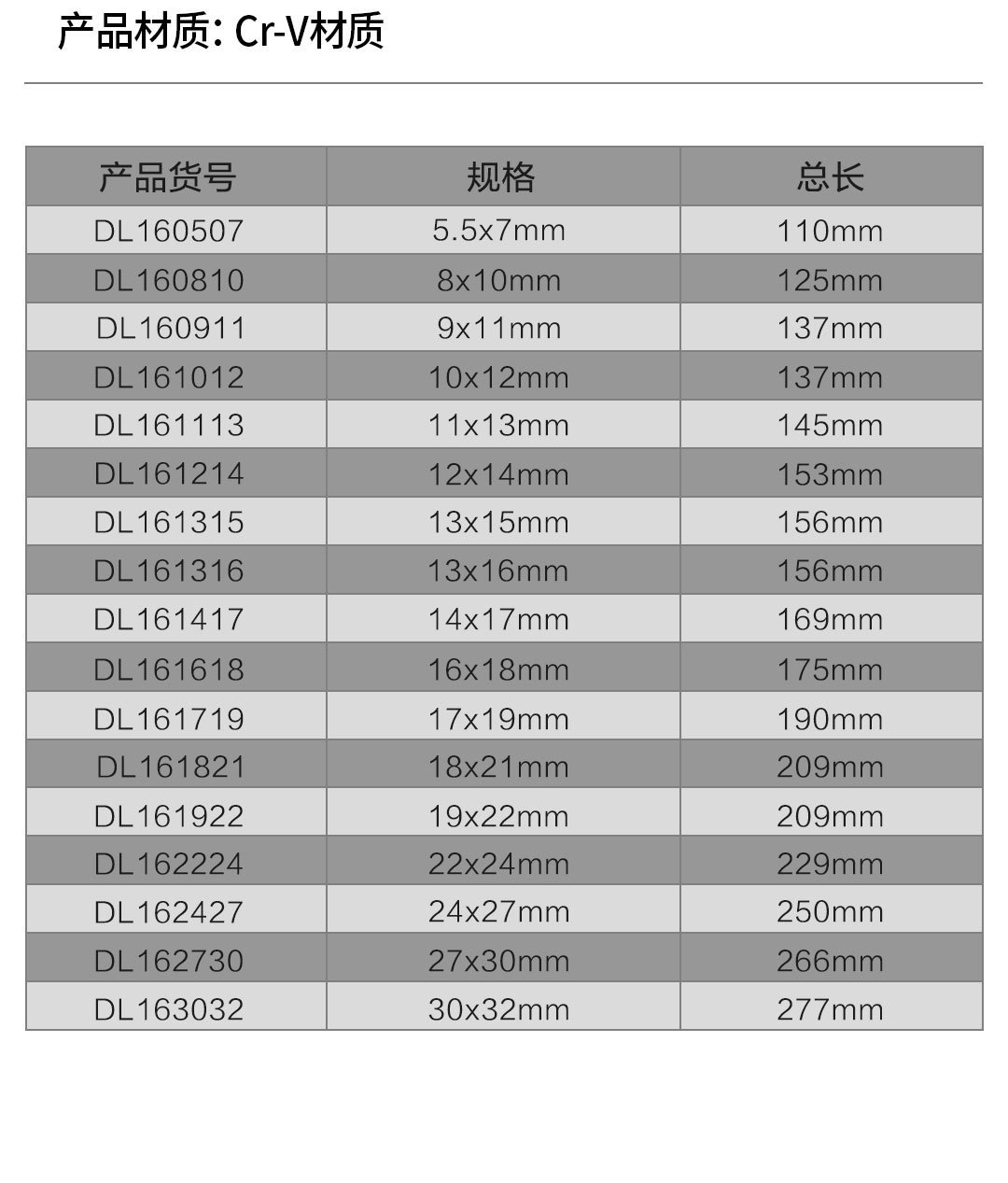 仕様とモデル DL160507 ミラー両口スパナ 5.5x7mm,DL160810 ミラー両口スパナ 8x10mm,DL160911 ミラー両口スパナ 9x11mm,DL161012 ミラー両口スパナ 10x12mm,DL161113 ミラー両口スパナ 11x13mm,DL161214 ミラー両口スパナ 12x14mm,DL161315 ミラー両口スパナ 13x15mm,DL161316 ミラー両口スパナ 13x16mm,DL161417 ミラー両口スパナ 14x17mm,DL161618 ミラー両口スパナ 16x18mm,DL161719 ミラー両口スパナ 17x19mm,DL161821 ミラー両口スパナ 18x21mm,DL161922 ミラー両口スパナ 19x22mm,DL162123 ミラー両口スパナ 21x23mm,DL162224 ミラー両口スパナ 22x24mm,DL162427 ミラー両口スパナ 24x27mm,DL162730 ミラー両口スパナ 27x30mm,DL163032 ミラー両口スパナ 30x32mm