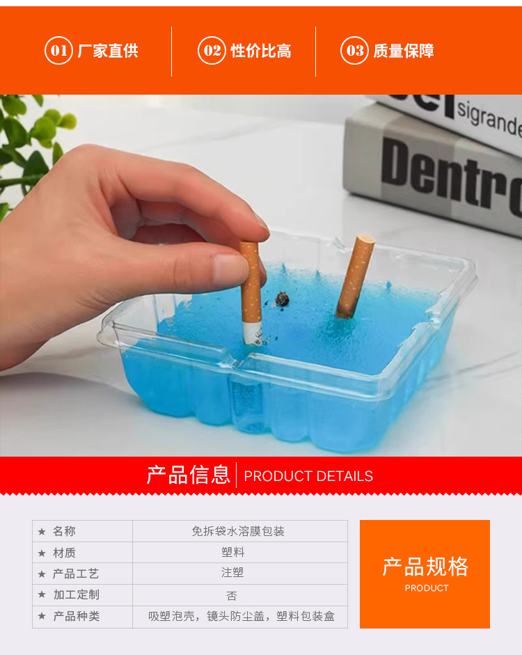 使い捨て灰皿、袋を破るまでに8秒、冷水で溶ける、使い捨て灰皿、小さな袋、水にさらされると固まります。