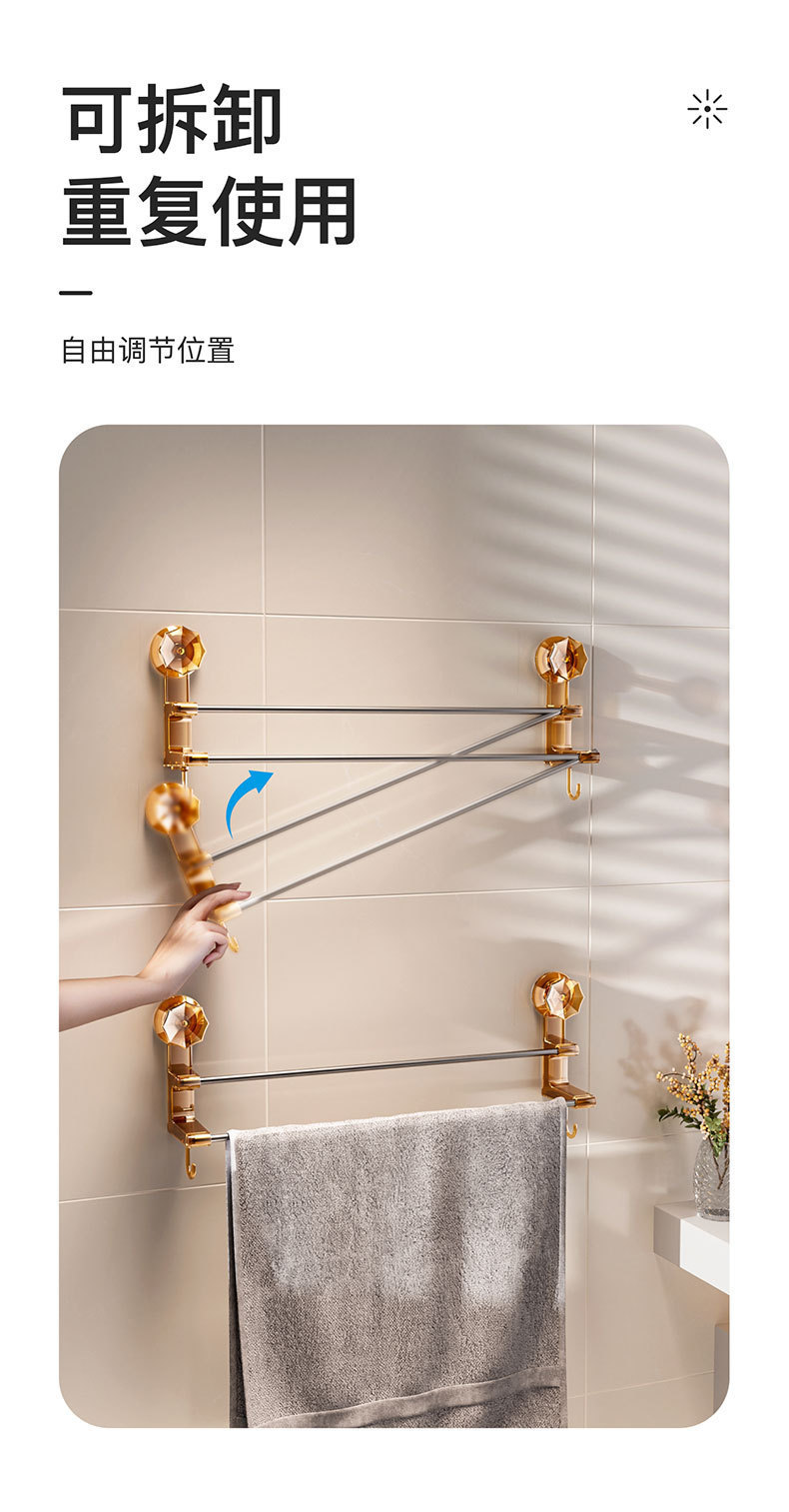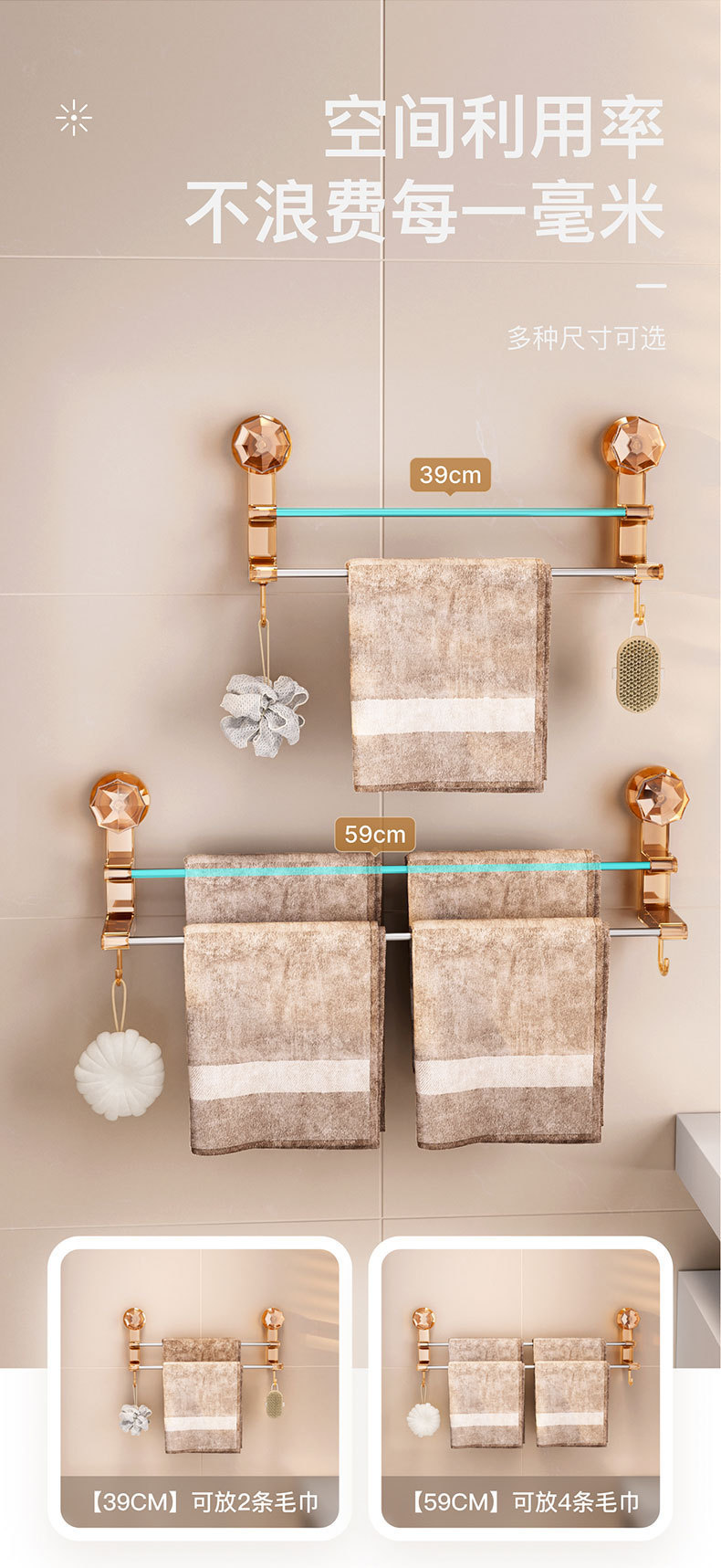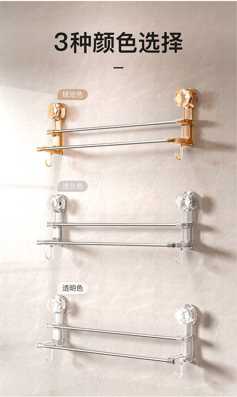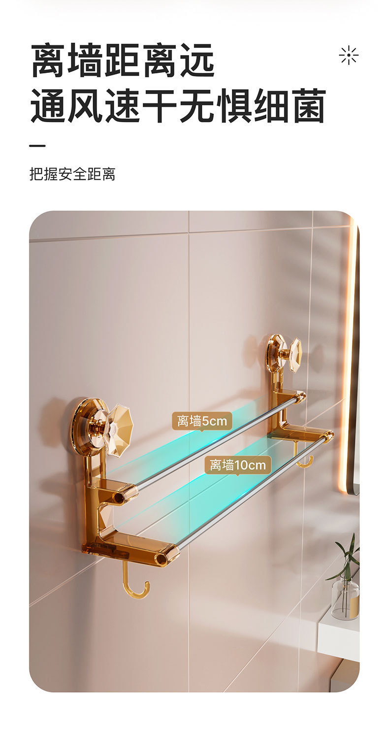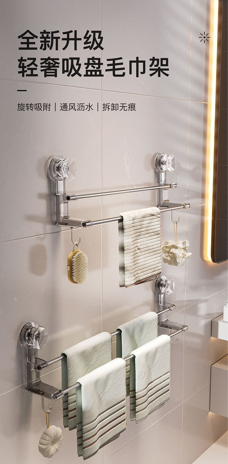 ダブルロッド吸盤タオルラック家庭用バスルーム収納ラックライト高級吊り下げロッドフック付きウェットとドライタオル両用収納ラック