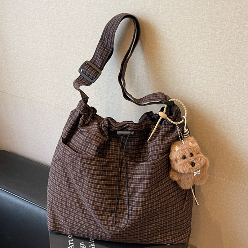 2025秋新款韩系ins慵懒风大容量帆布包褶皱格子包通勤单肩斜挎包
