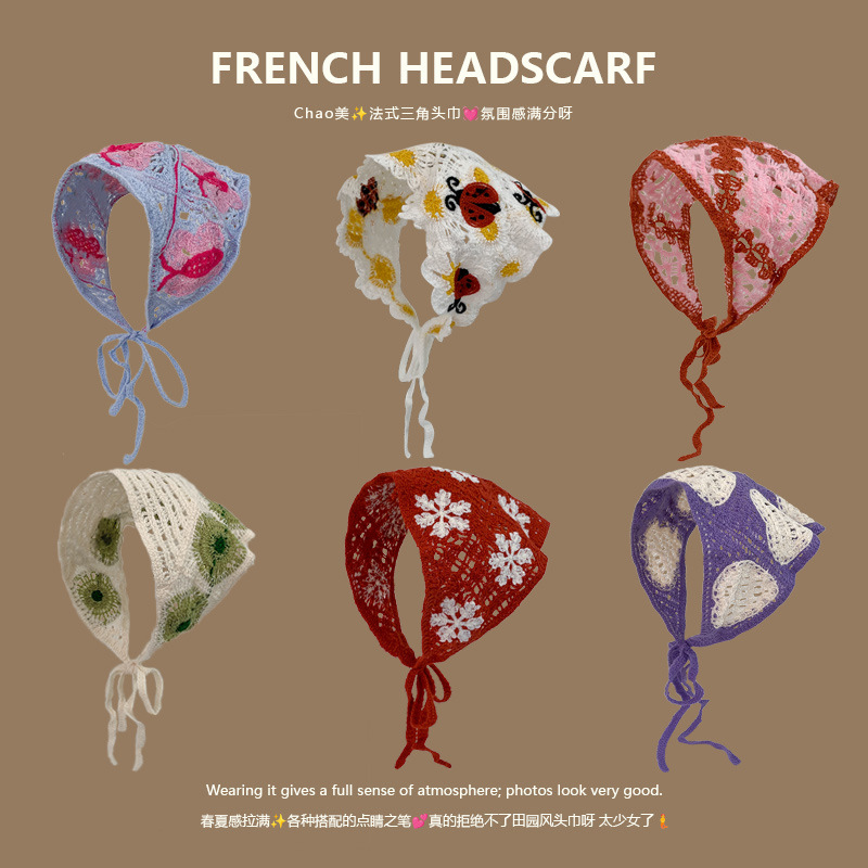 牧歌的なスタイルのフレンチレトロニットヘッドスカーフ、女性の旅行用、甘くてかわいいかぎ針編みのヘアバンド、ホットガールのトライアングルスカーフ、トレンディなヘアアクセサリー