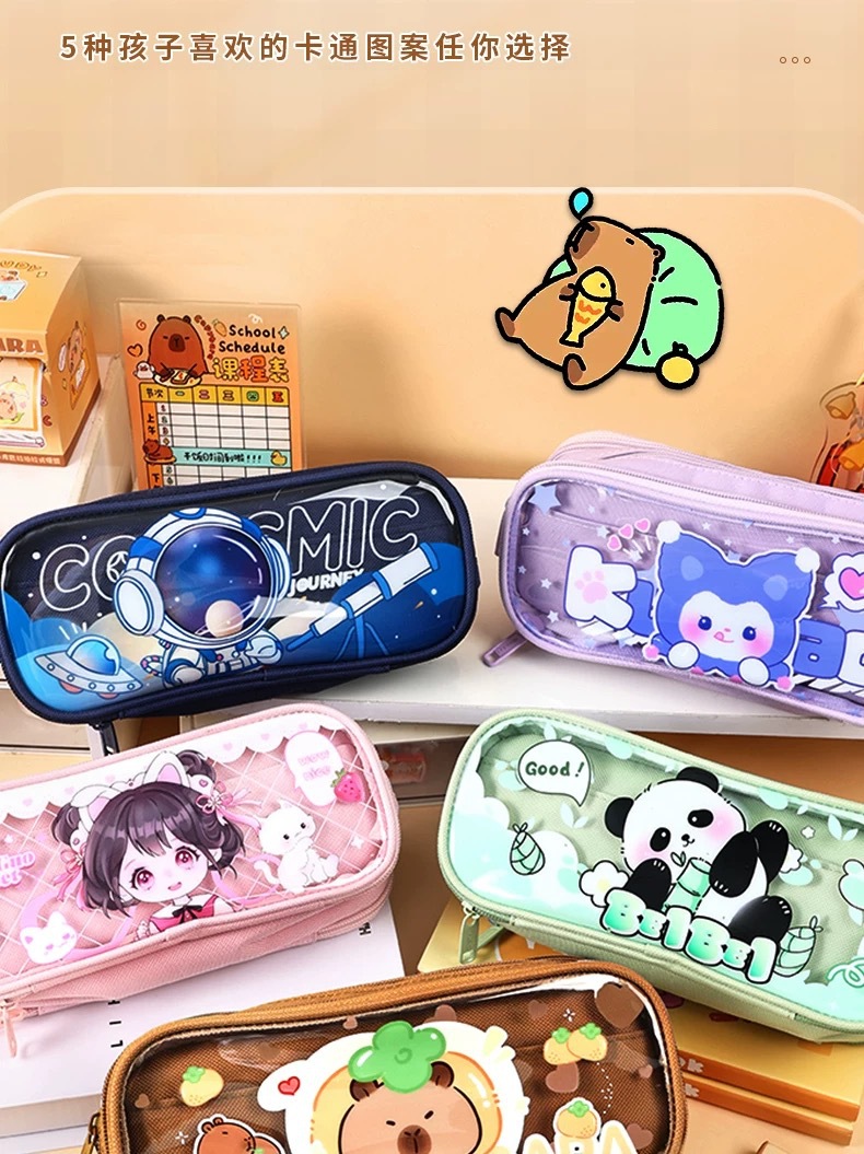 Kapibala 鉛筆バッグ漫画透明大容量文具箱男の子と女の子小学生筆箱多層文具箱