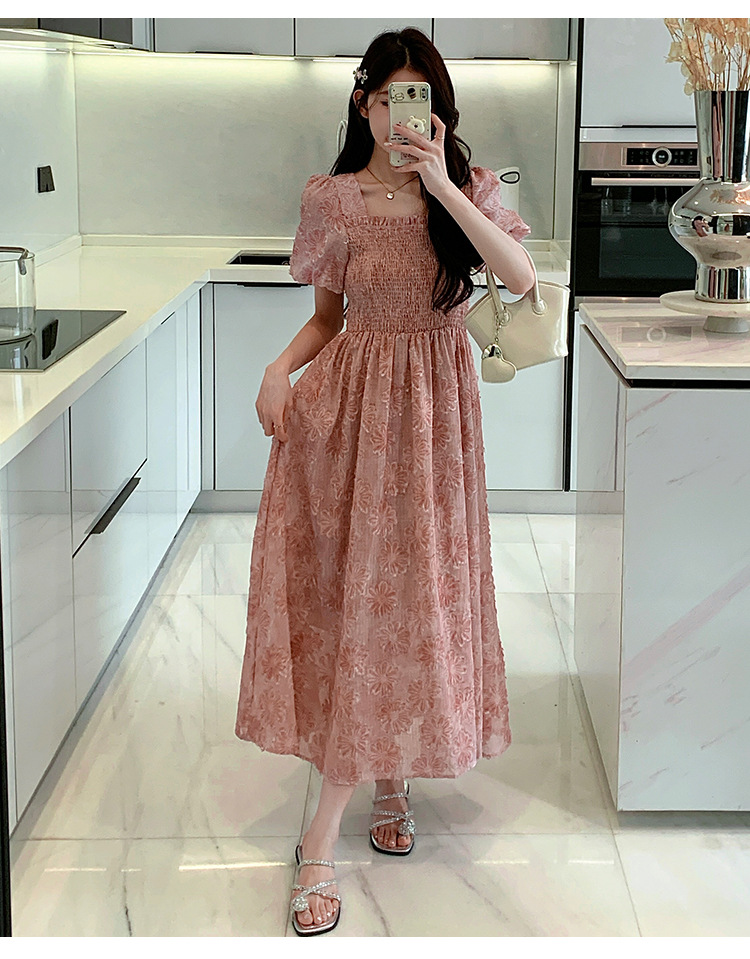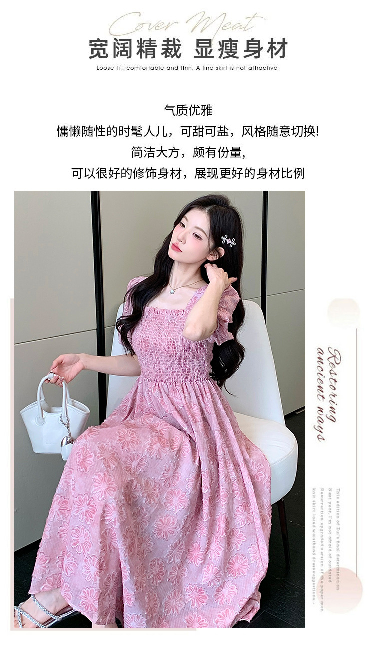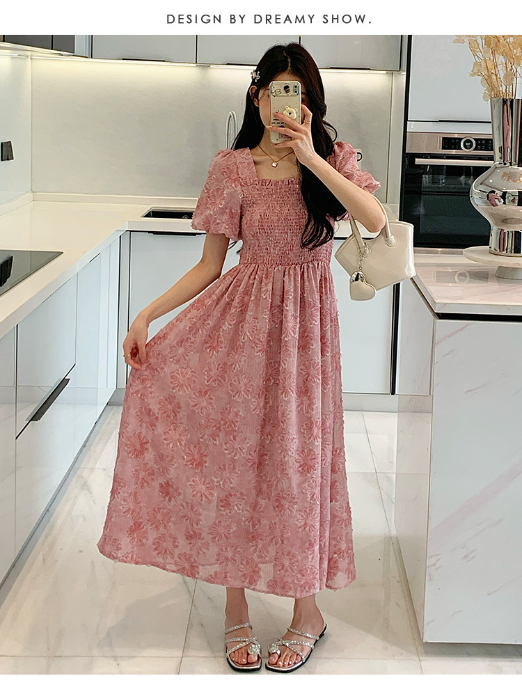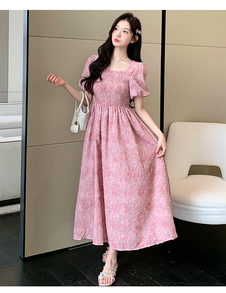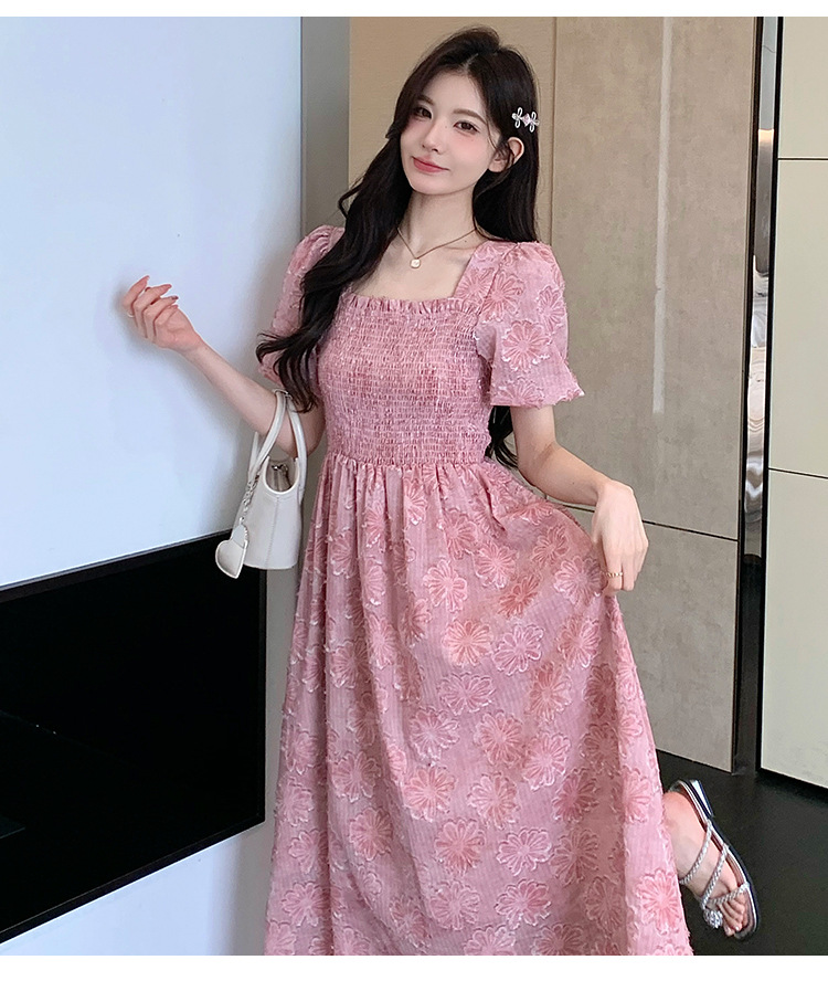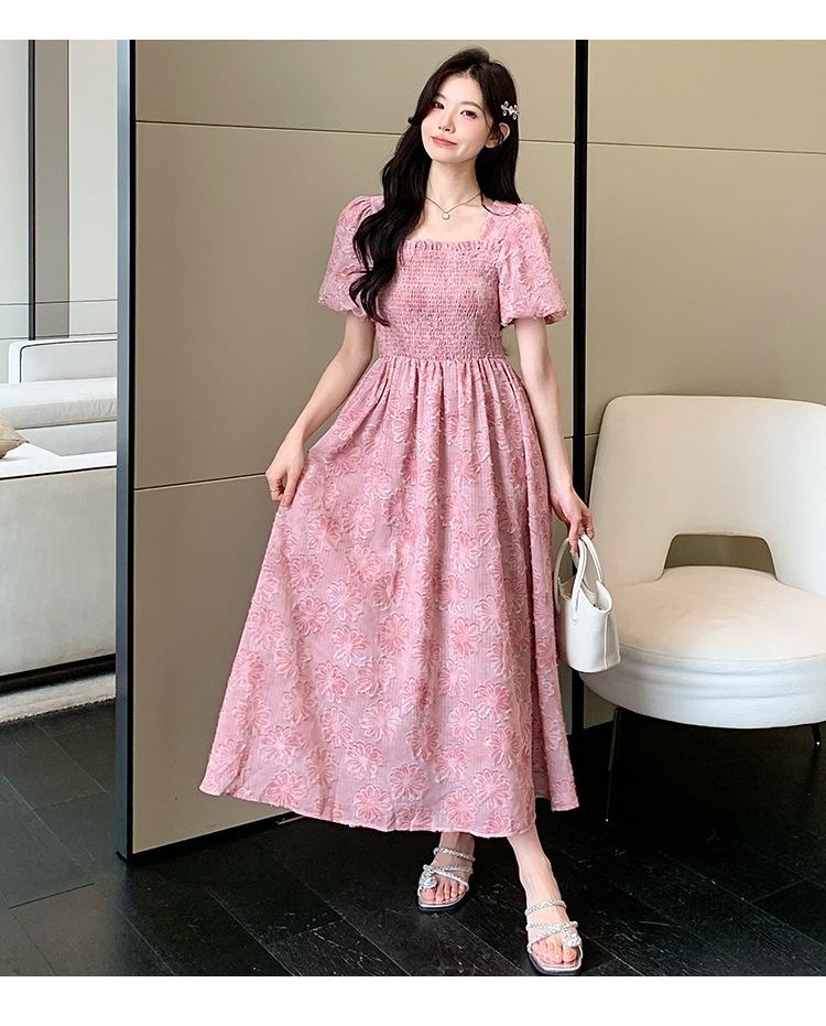 hmdd6220 フレンチジャカード半袖ドレス女性のための 2025 夏の新しい甘い年齢を減らすピンクのミドル丈スカート