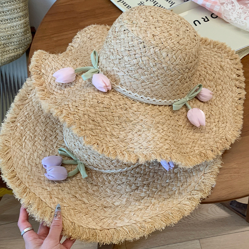 フランス風の甘いチューリップ柄のラフィア風帽子、女性用、夏の海辺の休暇に最適、大きなつばのビーチハット、日よけ帽子