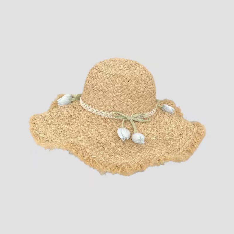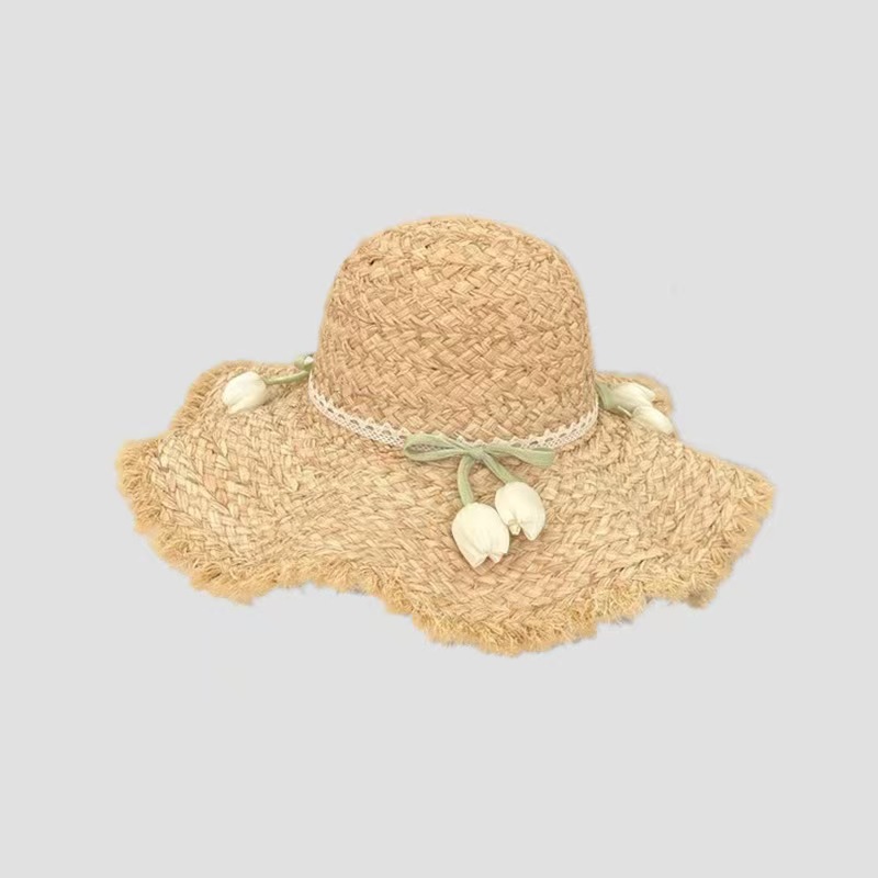 フレンチレースチューリップラフィア帽子女性の夏の海辺の休暇大きなつばビーチサンハットサンハット