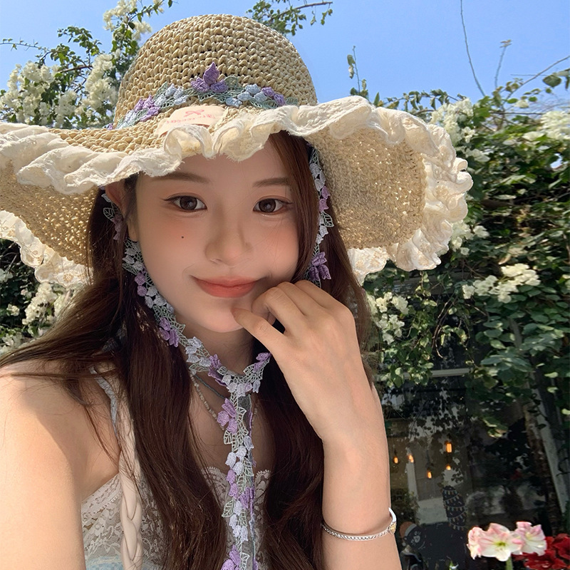 花朵蕾丝边草帽女夏季海边度假大帽檐遮阳防晒帽沙滩编织太阳帽子