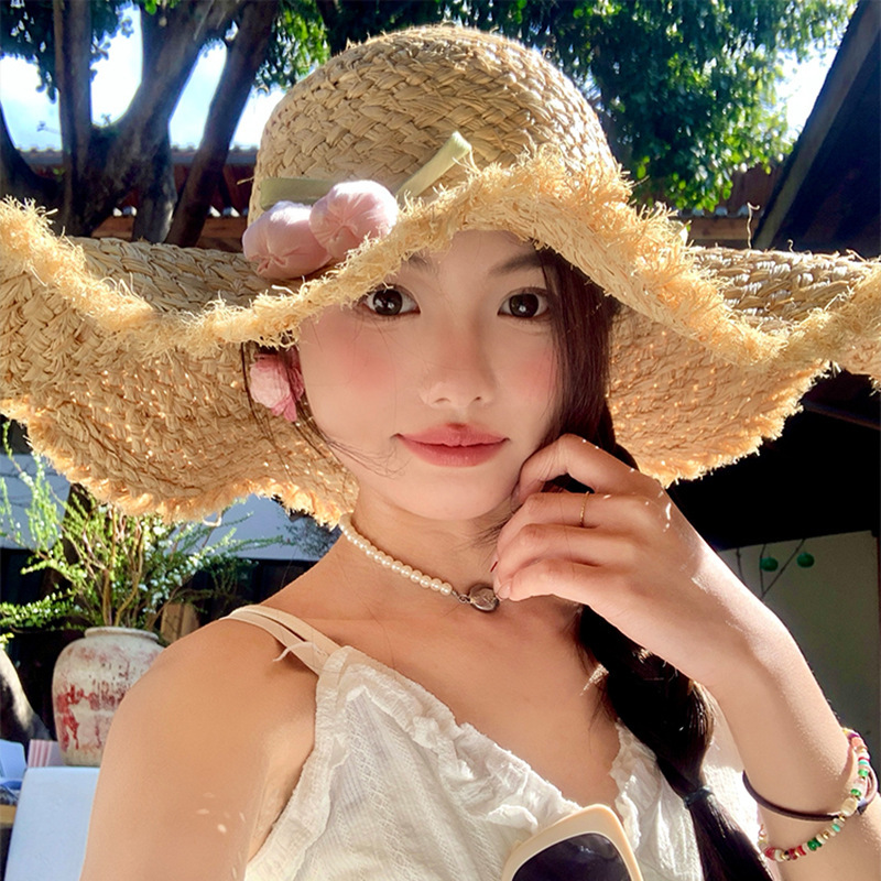 拉菲手工编大花朵百搭遮阳防晒帽女夏季度假海边大檐太阳帽