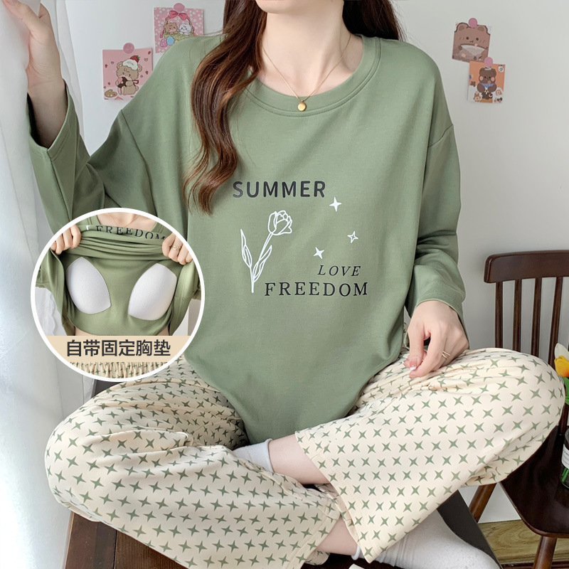 2024新型春秋長袖胸パッド付きパジャマ女性綿冬服セット