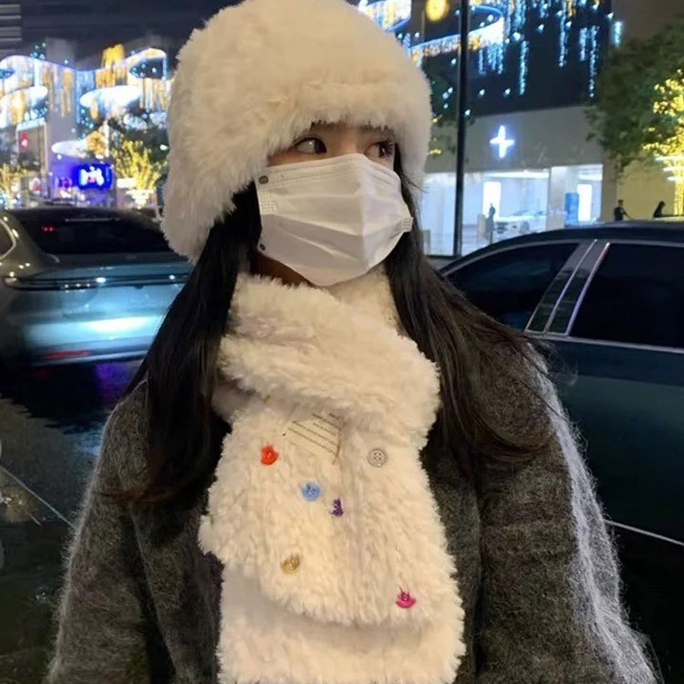 マフラーの冬の女性のタイプはかわいいです。ボタンの毛がふわふわしています。