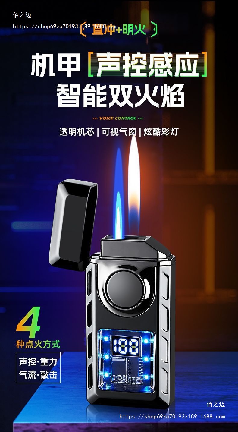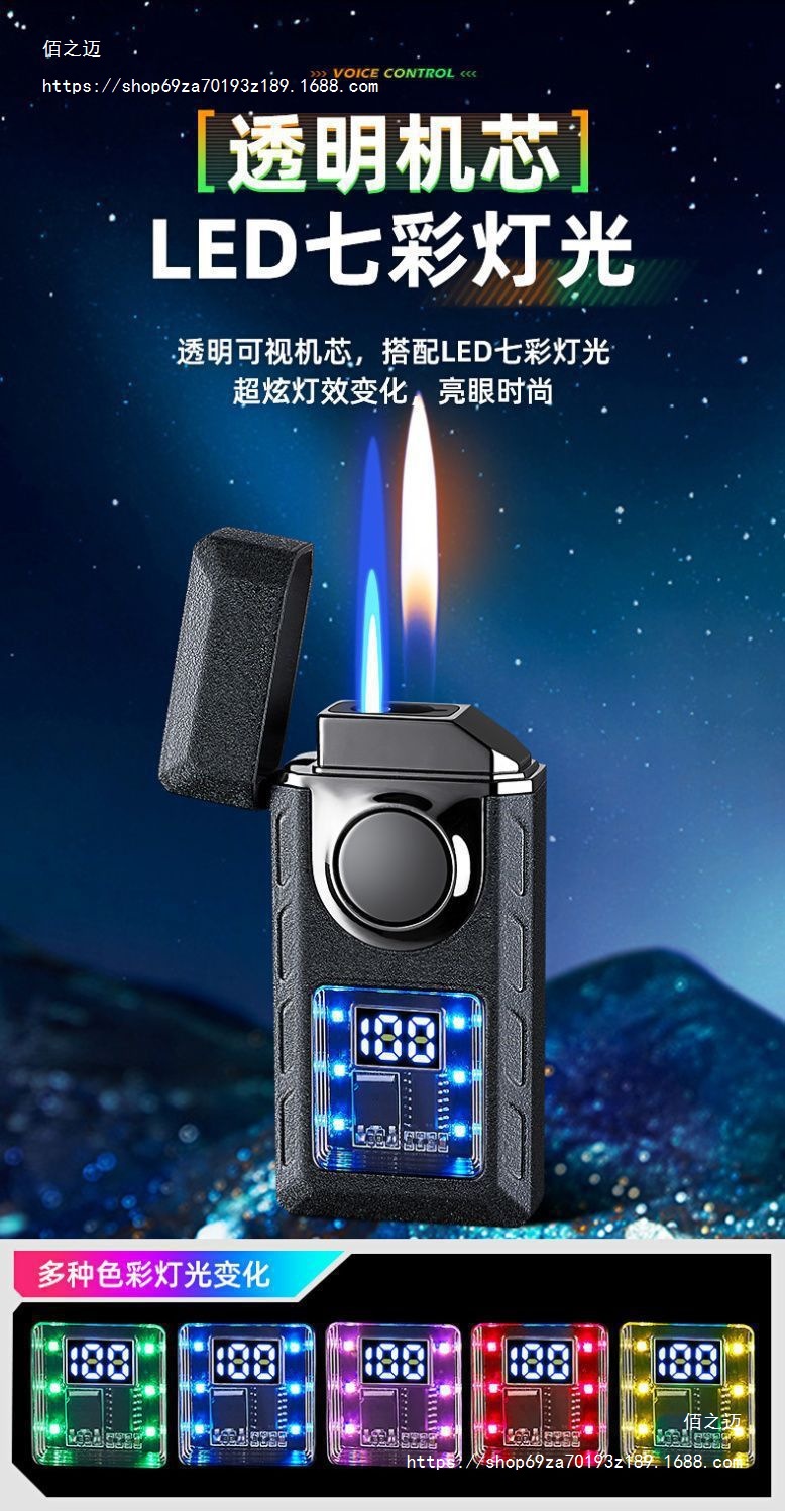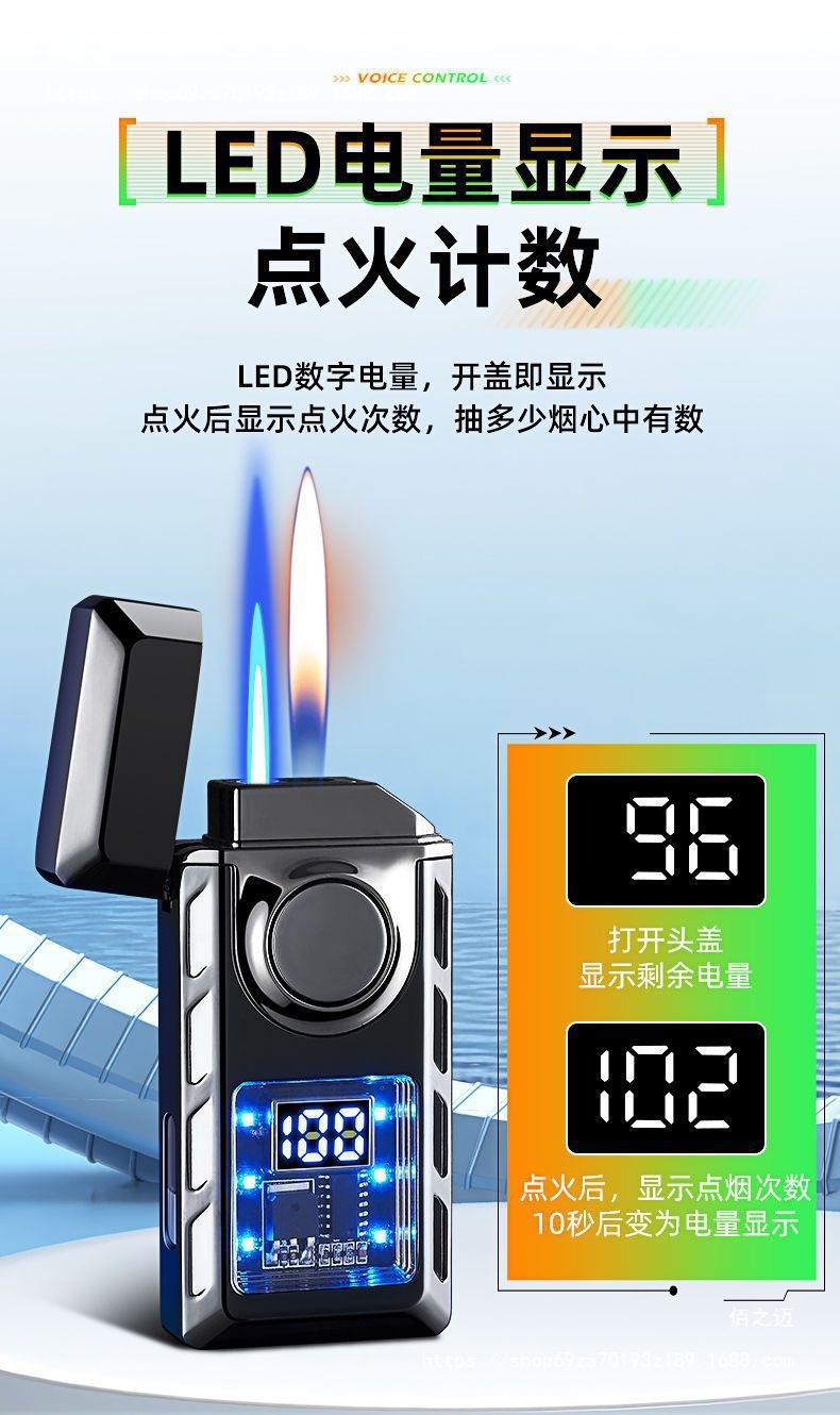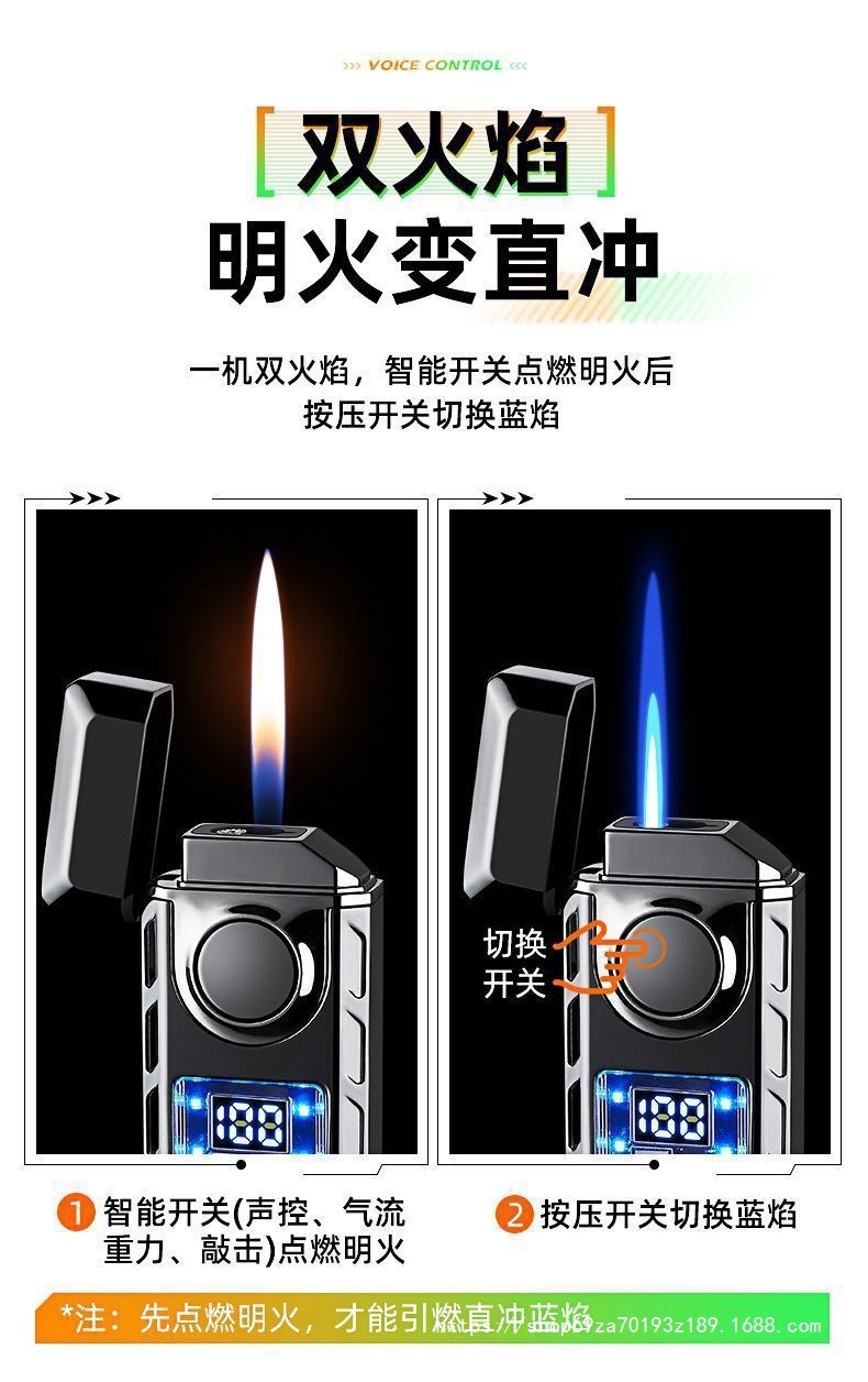 智能声控双火焰炫彩LED彩灯显示点火次数多种点火方式充气打火机