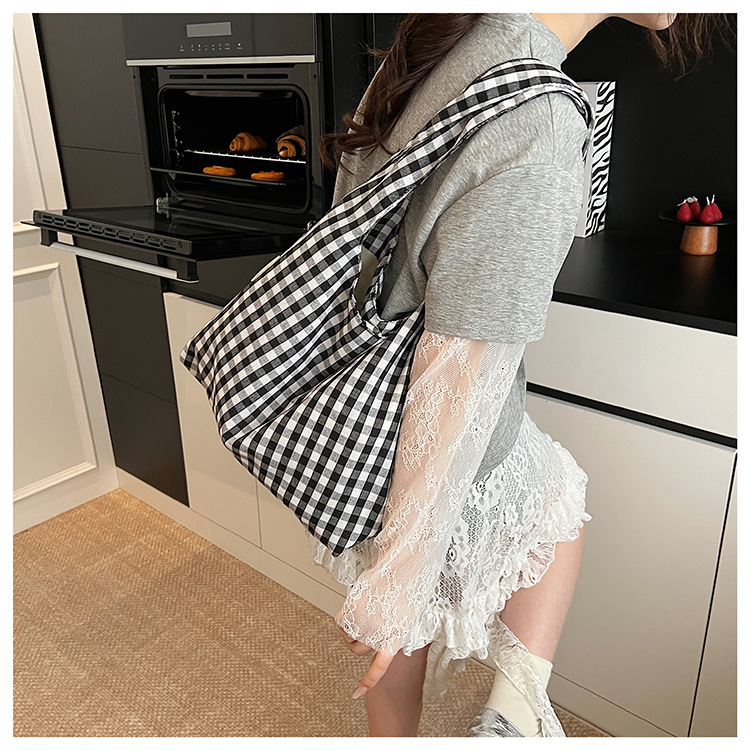 夏のレイジースタイル白黒チェック柄ショッピングバッグオープン特大容量ショルダーバッグカジュアルシンプルなポータブルトートバッグ