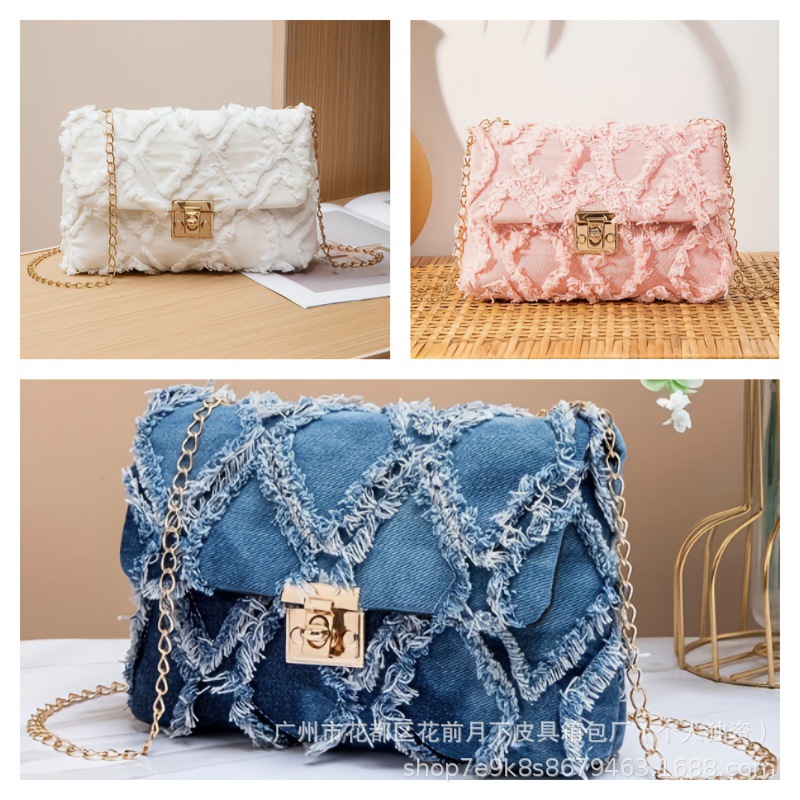 高级感单肩包牛仔布链条翻盖小方包小香风高品质菱格百搭时尚女包