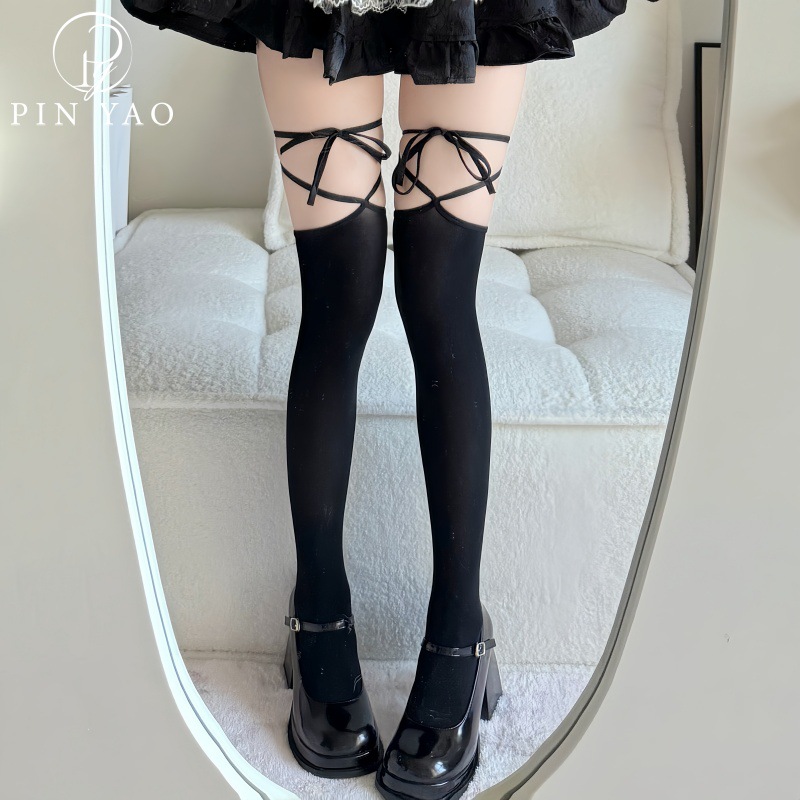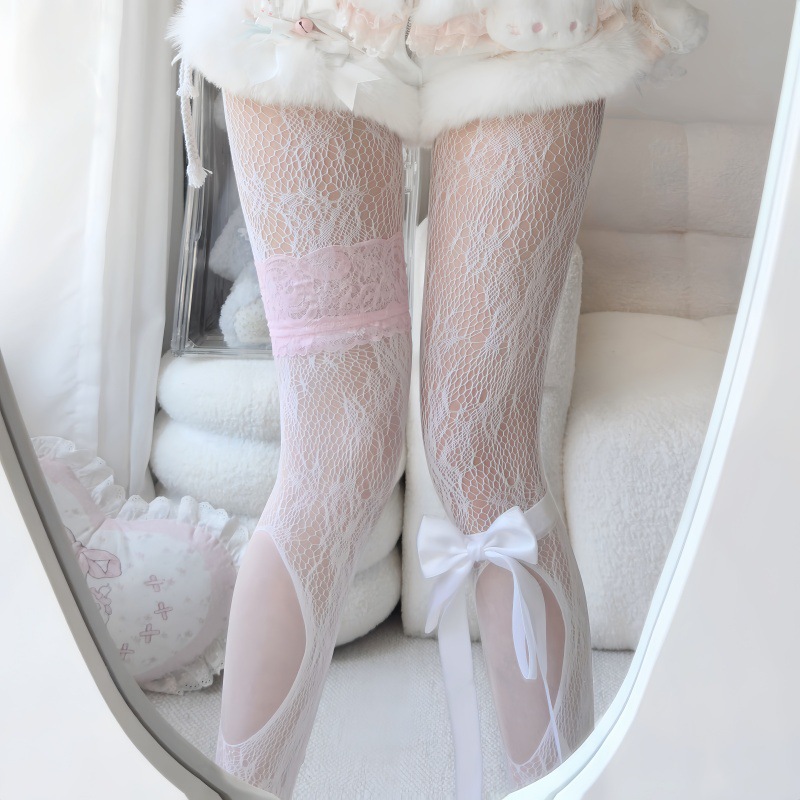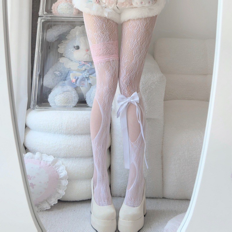 愛の白いストッキングの女性の春夏の薄いタイプの甘い蝶結びの白いタイツのロリータの丸い波はjk黒い糸をつけます。