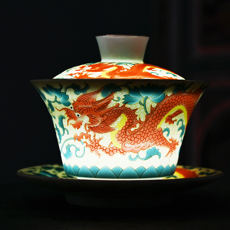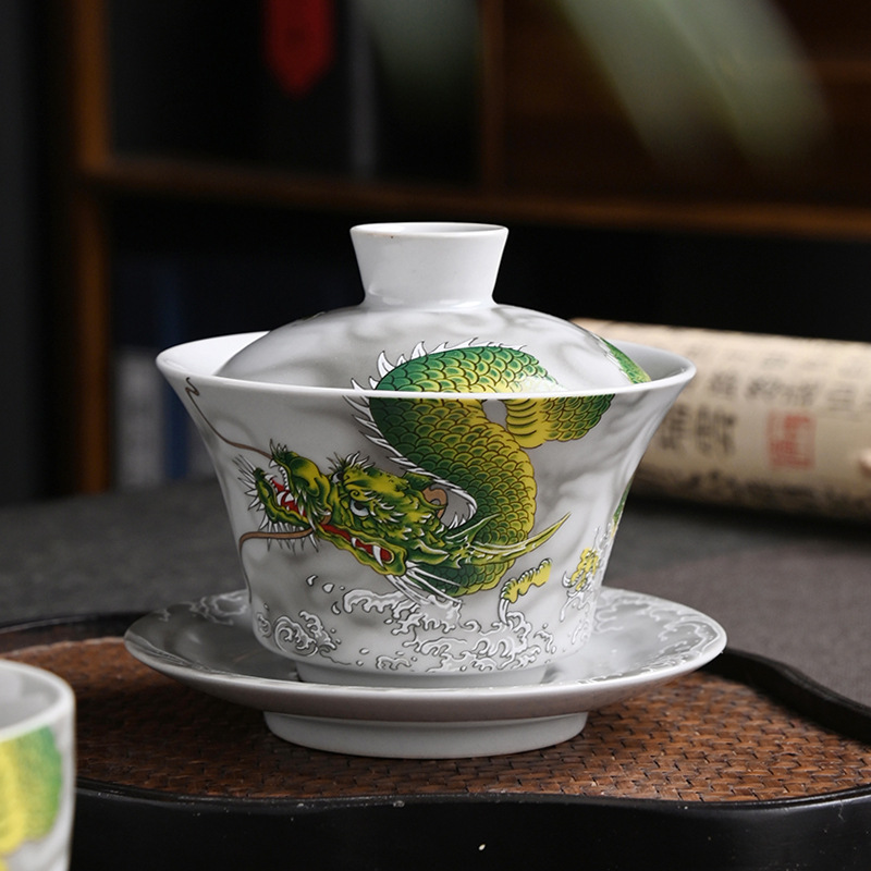 景徳鎮のレトロな陶泥の青龍の三才は碗の工夫の茶器の陶磁器のお茶の碗のメーカーをかぶせて直接販売します。