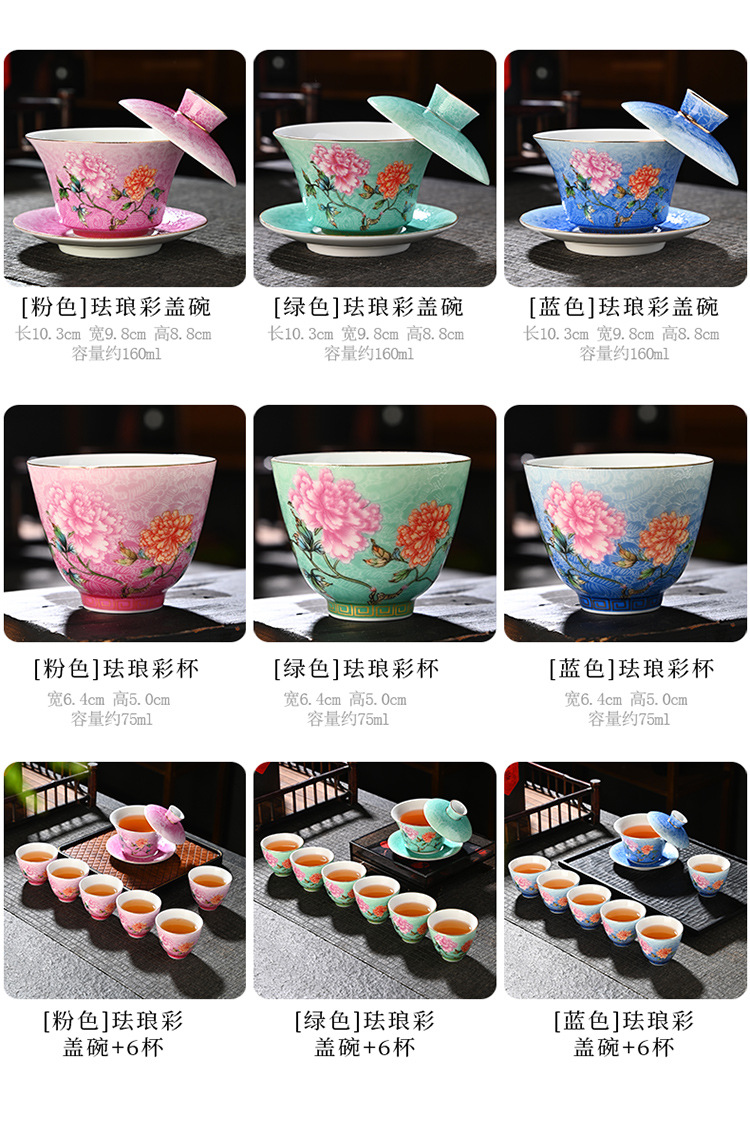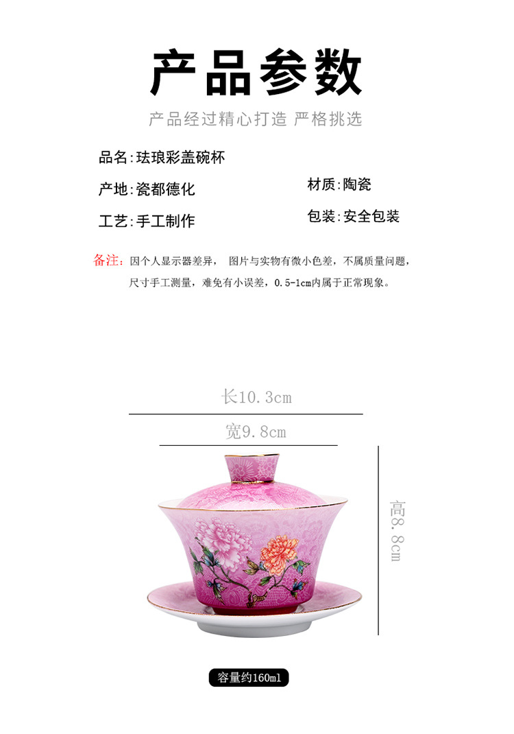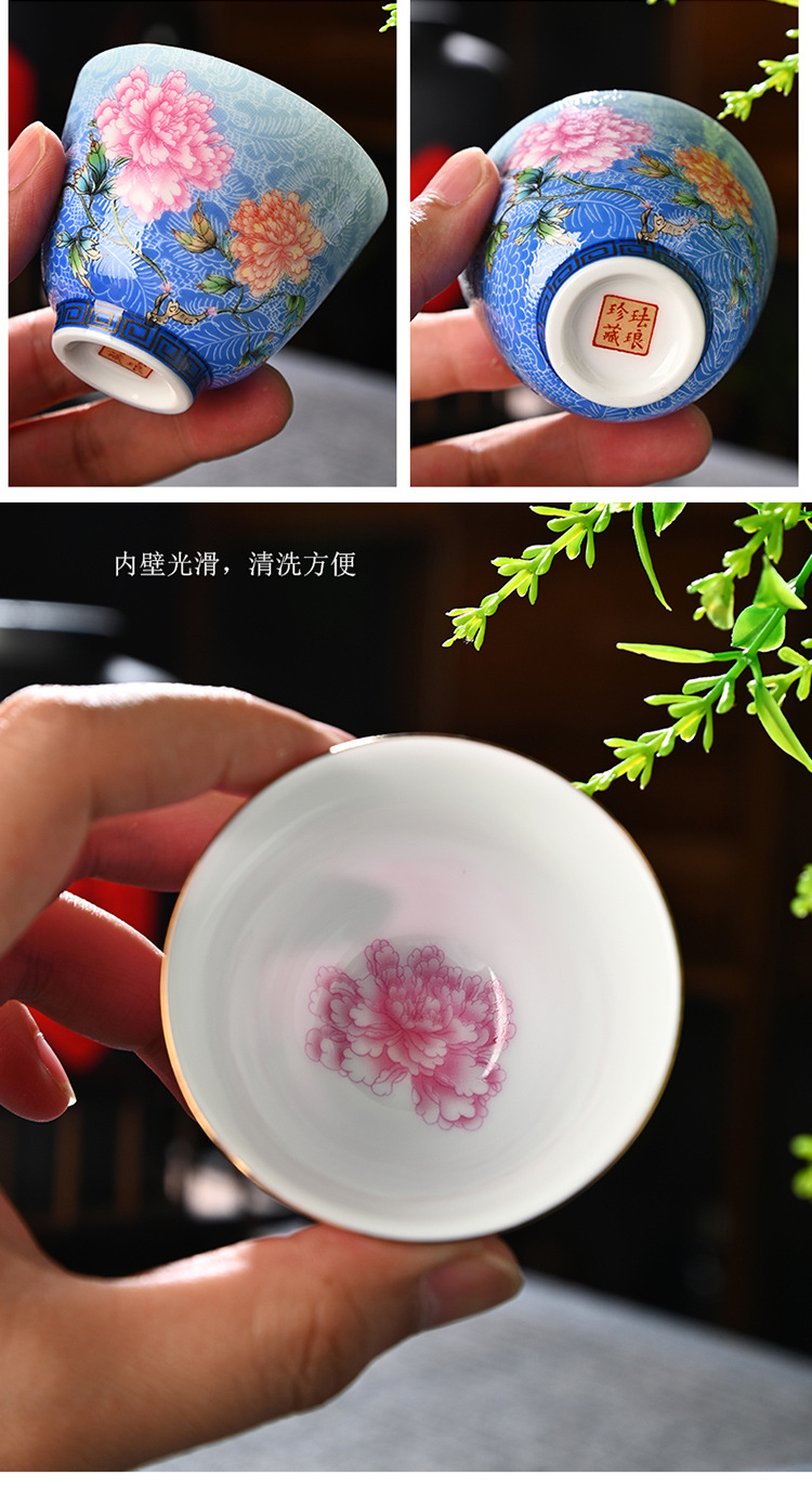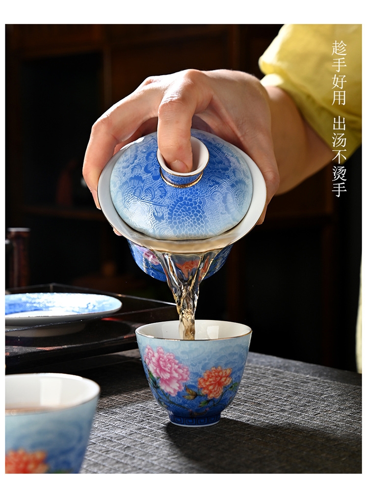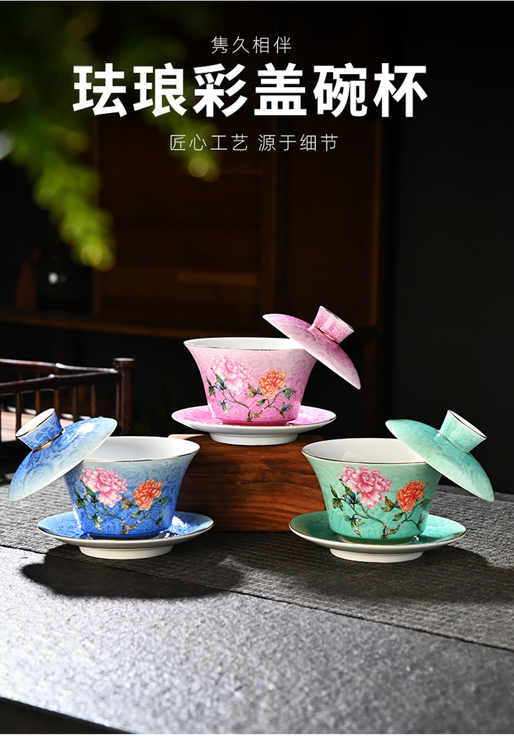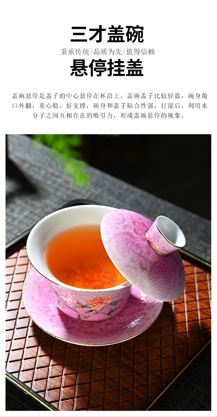 景徳鎮国潮エナメル彩蓋碗手作り花藍地万花三才茶碗中国式陶磁器茶器