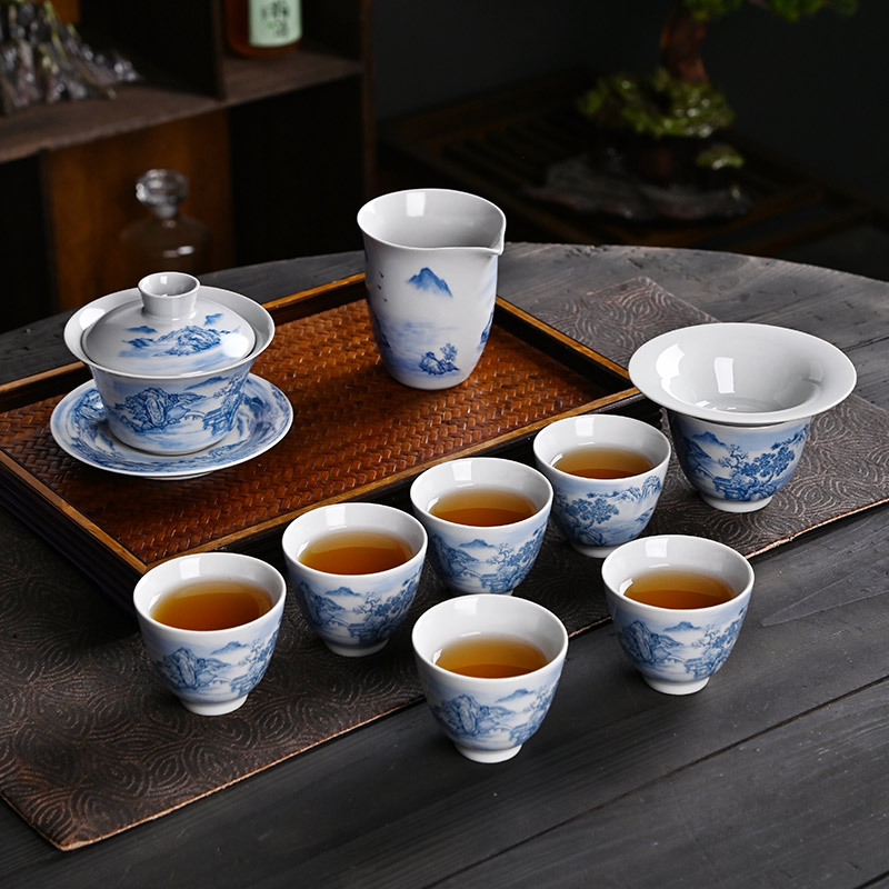 景徳鎮の工夫の茶器の高級な贈り物の箱のお土産の卸売りの陶磁器の山水の蓋の碗のお茶の杯のセットのビジネスの贈り物