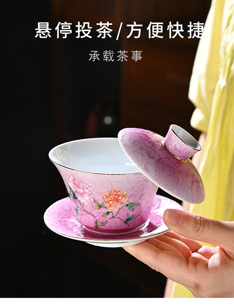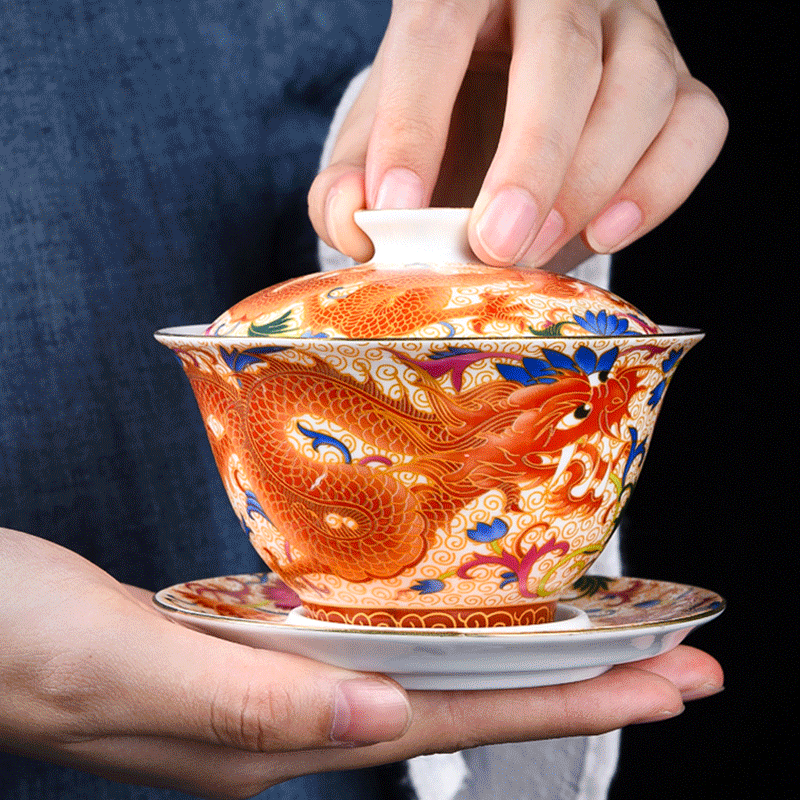 在庫ありの琺瑯彩蓋碗、金彩龍鳳陶磁茶器、三才蓋碗、徳化白磁、熱くないお茶碗