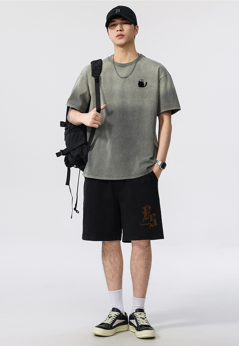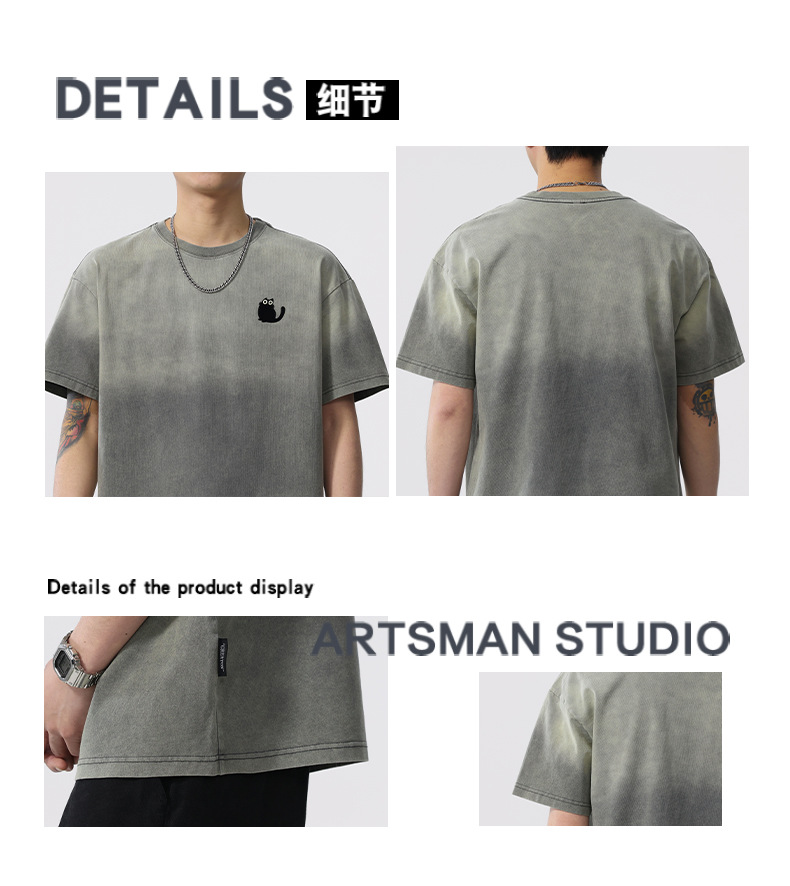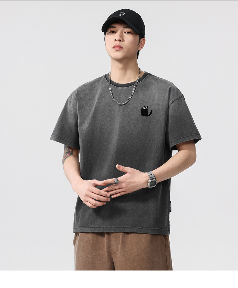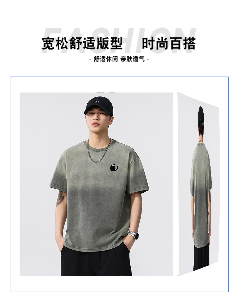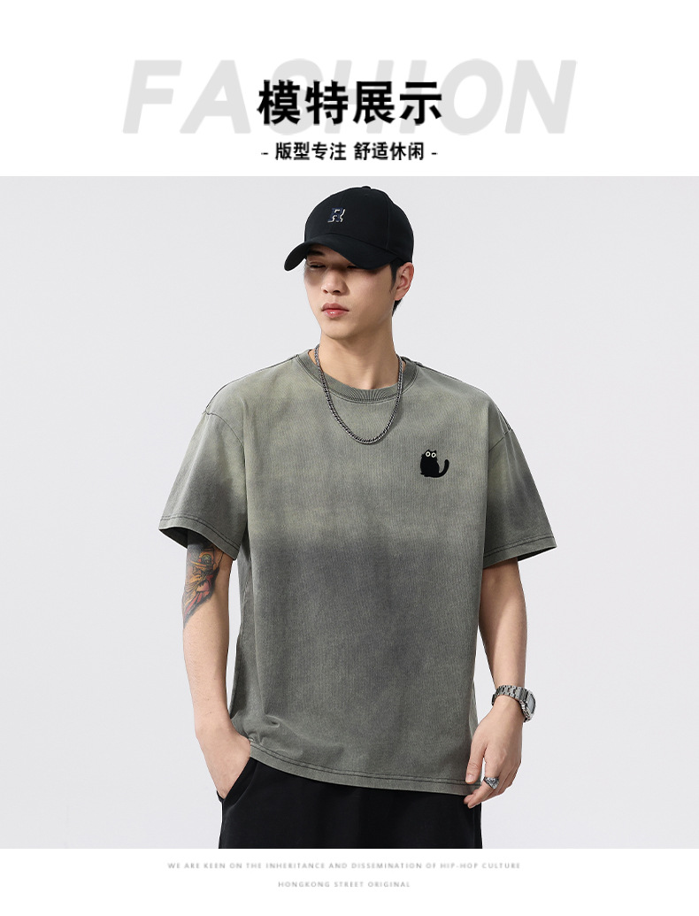 15161 # 純綿大きいサイズ半袖Tシャツレトロウォッシュヘビーデューティオールドグラデーション猫発泡小プリント半袖Tシャツ