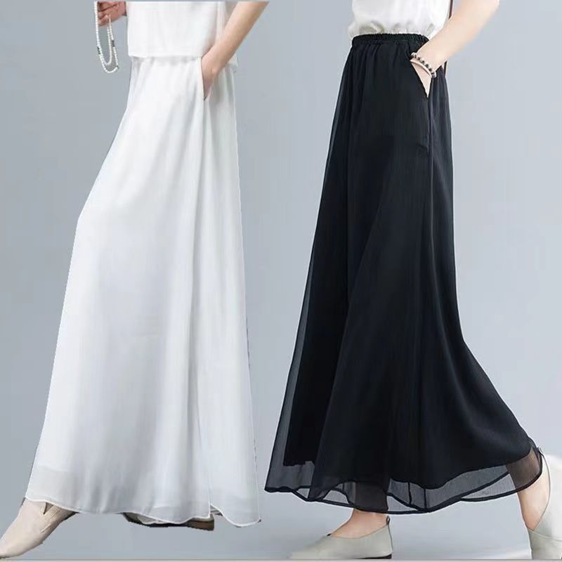 【ポケット追加】女性用二層シフォンワイドパンツ、ウエストゴム、薄手パンツ、ハイウエスト、ゆったり、エレガントなスカートパンツ