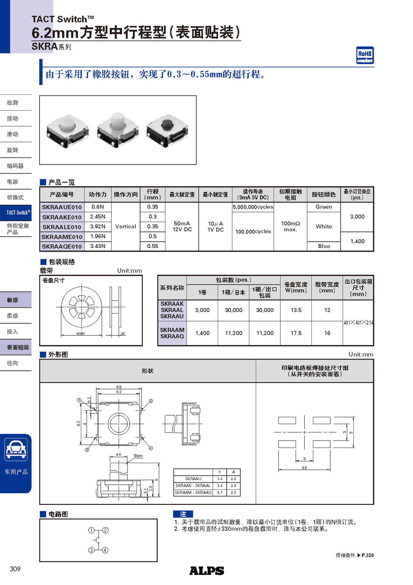 ALPS タクトスイッチ SKRAAME010 静音防塵防水シリコンカーマイクロボタン