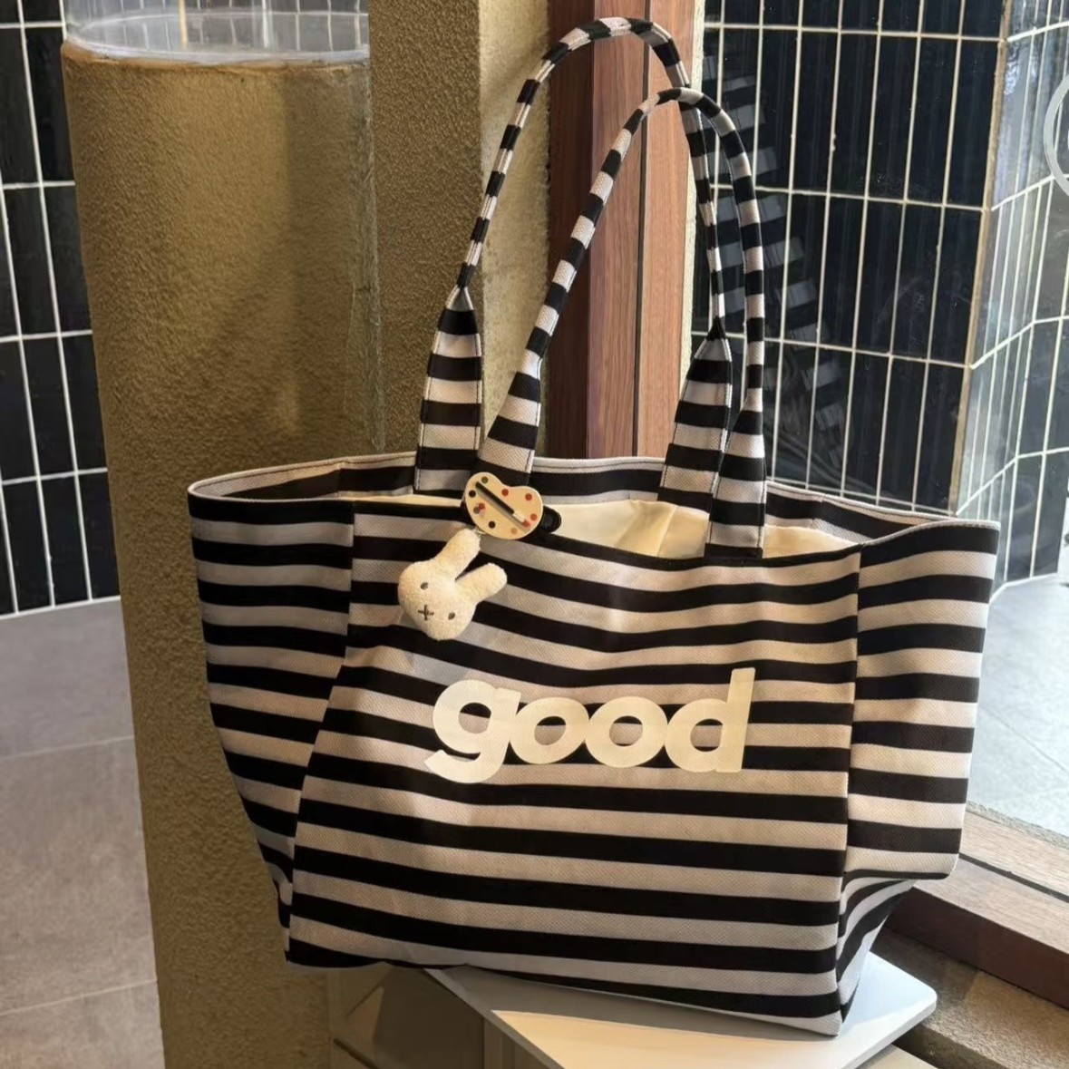 2025 新しいトレンディな韓国ルーズスタイルトートバッグ大容量の女性のバッグカレッジスタイルストライプキャンバスバッグ