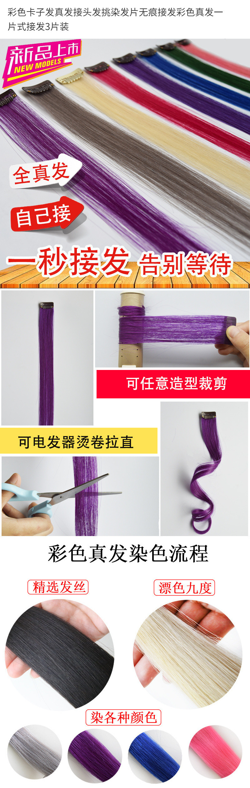 カラフルクリップインヘア、本物のヘアエクステ、ハイライトヘアピース、シームレスヘアエクステ、カラフルな本物のヘア、ワンピースヘアエクステ、3ピース