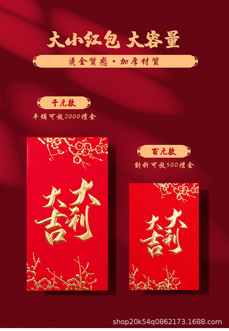 クリエイティブな富と幸運の赤い封筒バッグ、パーソナライズされた千元の大きな赤い封筒、赤い背景とホットスタンピング、ハイエンドのギフト卸売