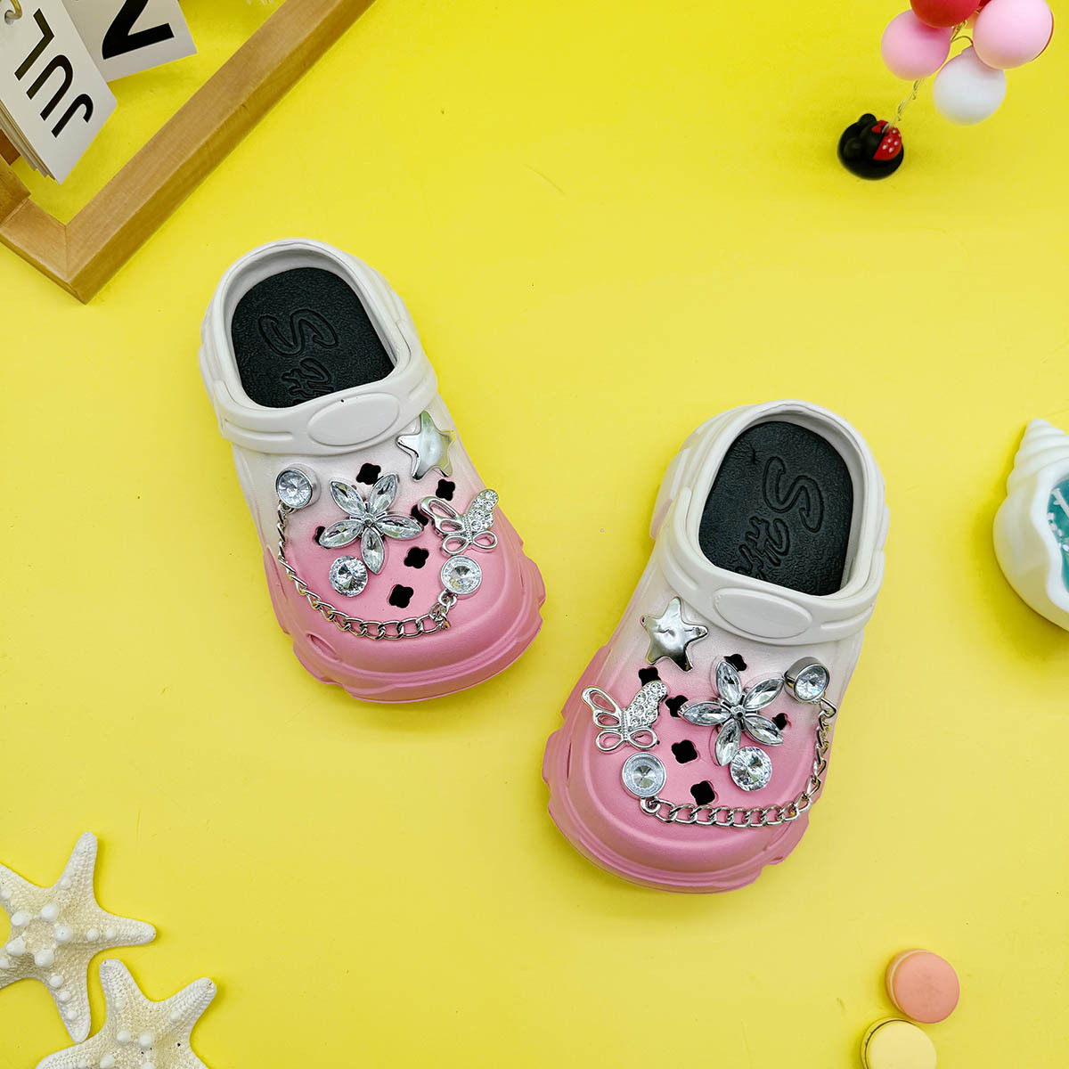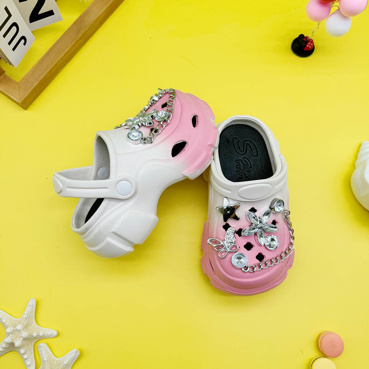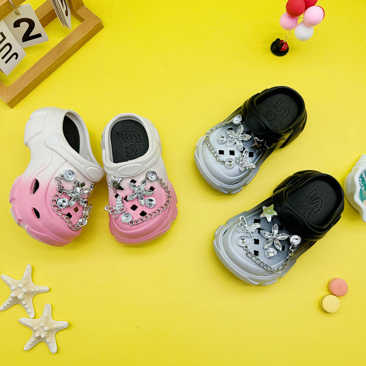 男の子と女の子向けの多用途な親子スリッパ、新しい漫画の中空蝶クリスタルフラワーホールシューズ、柔らかい底、滑り止めつま先サンダル