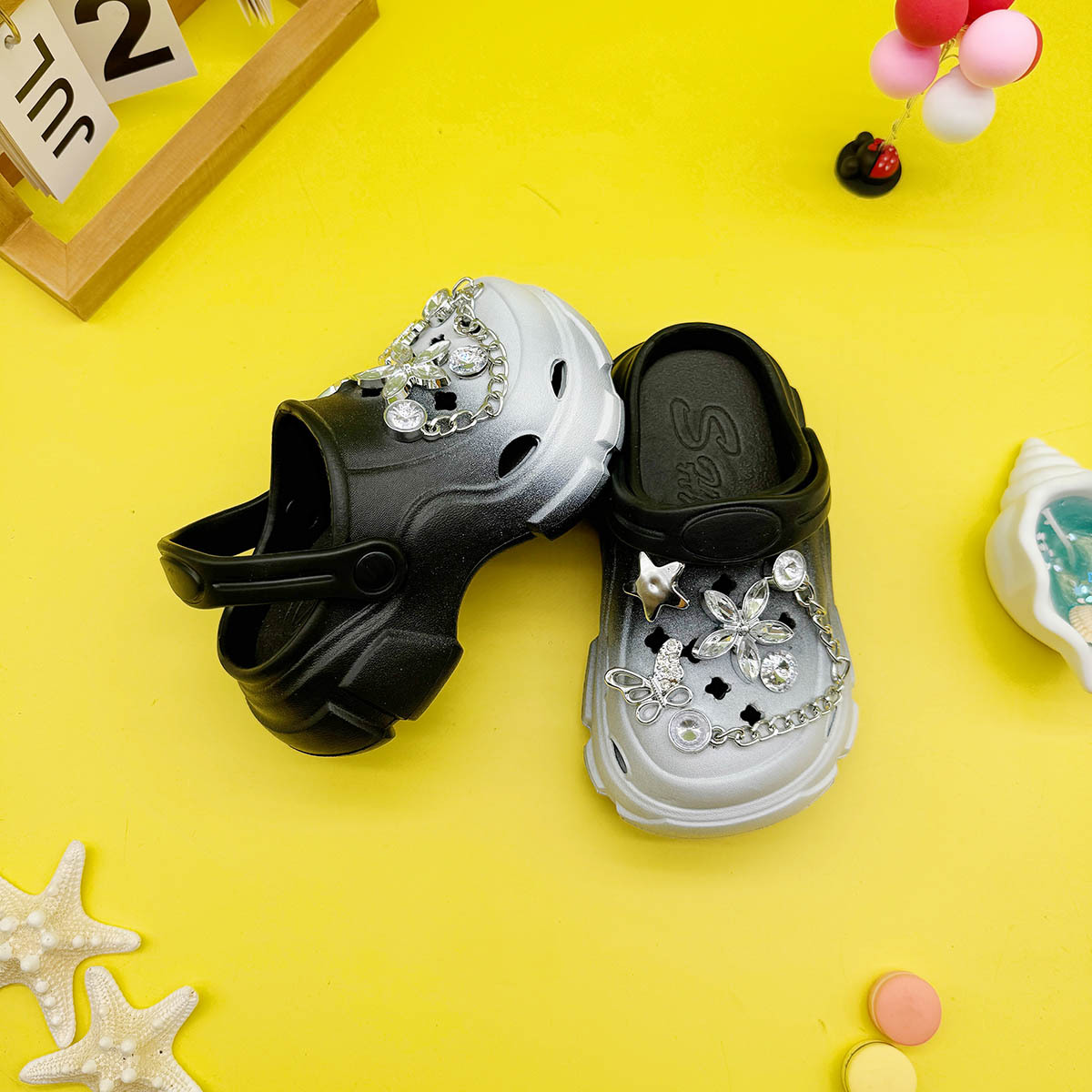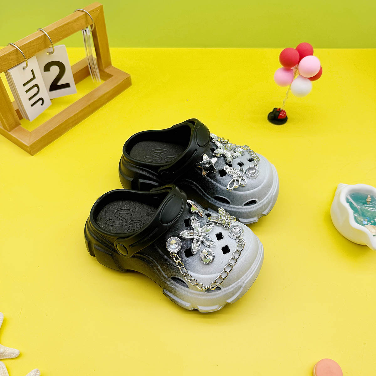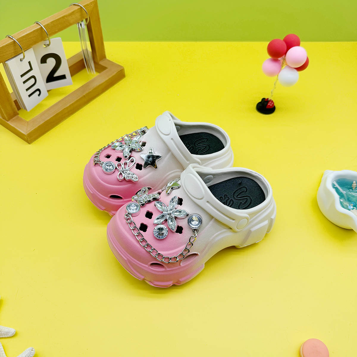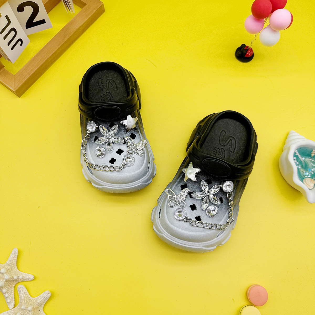 男の子と女の子向けの多用途な親子スリッパ、新しい漫画の中空蝶クリスタルフラワーホールシューズ、柔らかい底、滑り止めつま先サンダル