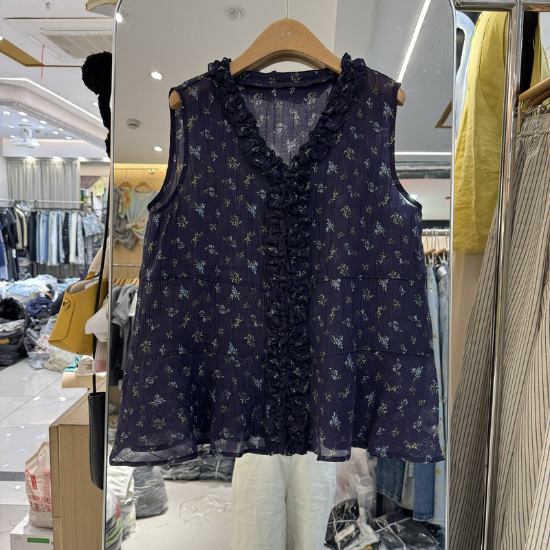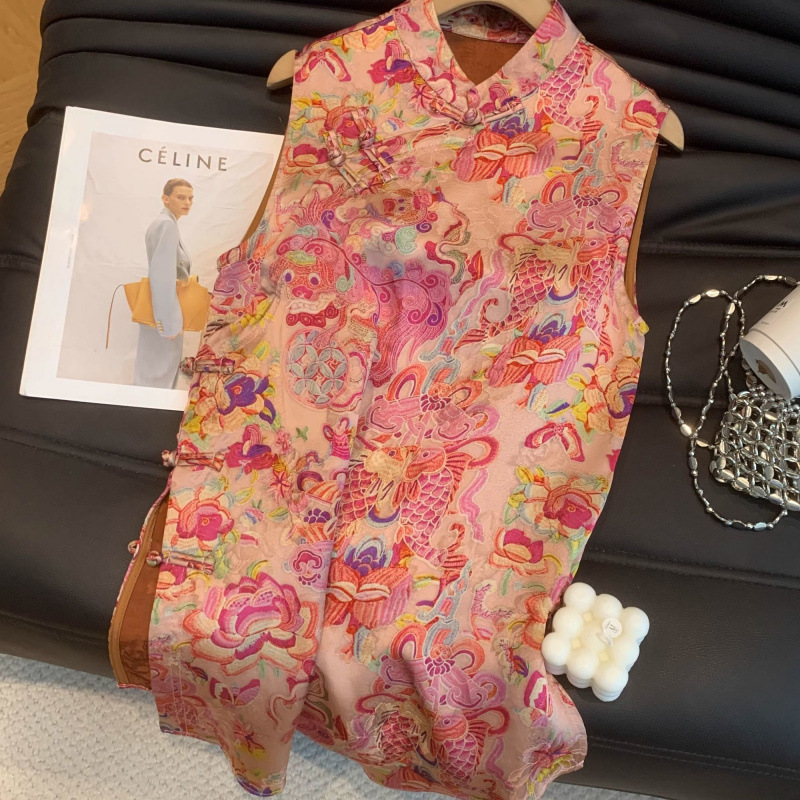 本物のヨーロッパの夏の新しいファッション多用途スタンドカラーボタンノースリーブプリントベストレディースルーズトップトレンディ
