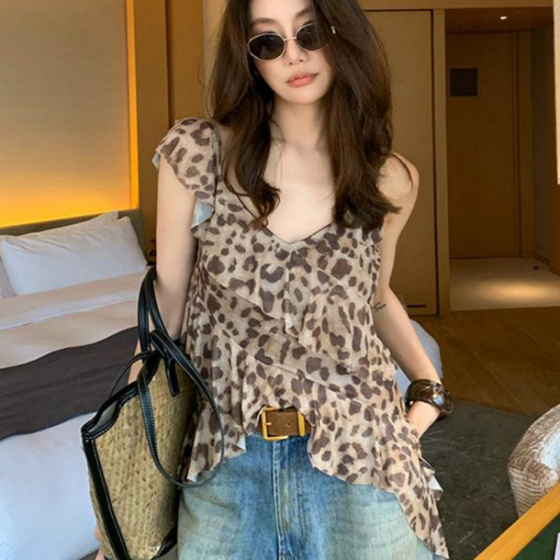 Yufeng ヒョウ柄不規則なネックラインのベストサスペンダーレディース夏の新しいデザインのゆったりとしたウエスタンスタイルのトップ