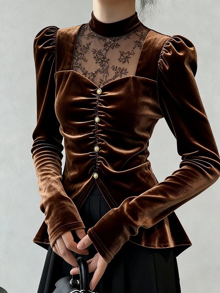 高端小资小上衣轻奢高级感法式气质职业蕾丝拼接黑色丝绒衬衫女秋
