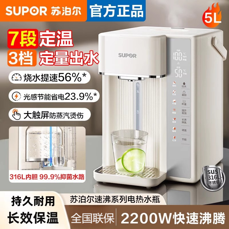 Supor 電気ケトル 5L 二層 316L ステンレス鋼 2200W マルチセクション断熱ケトル SW-50T616PRO