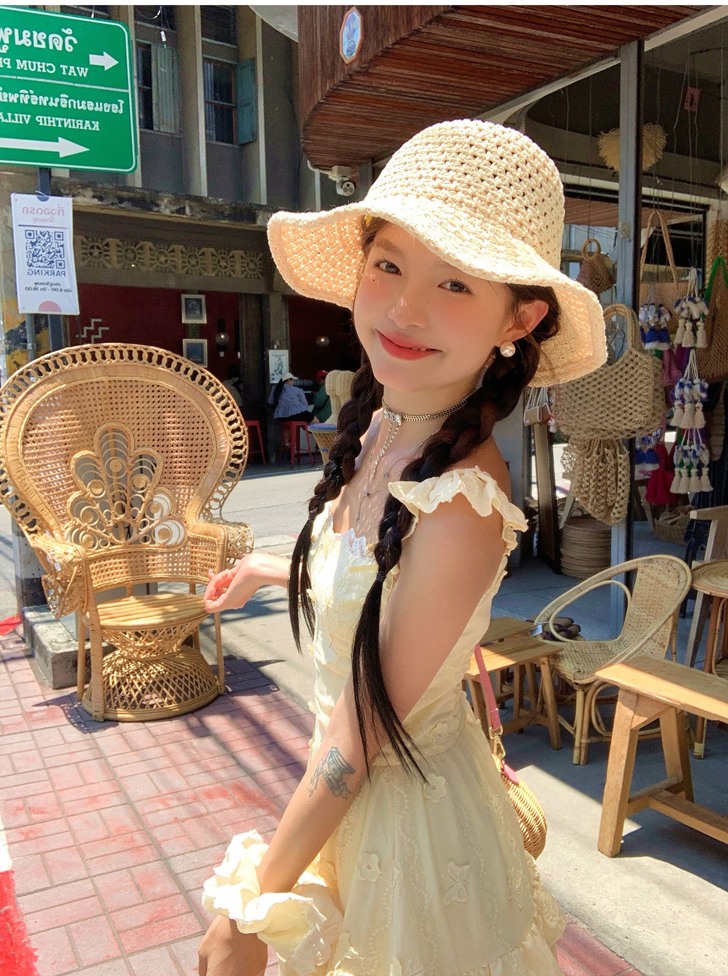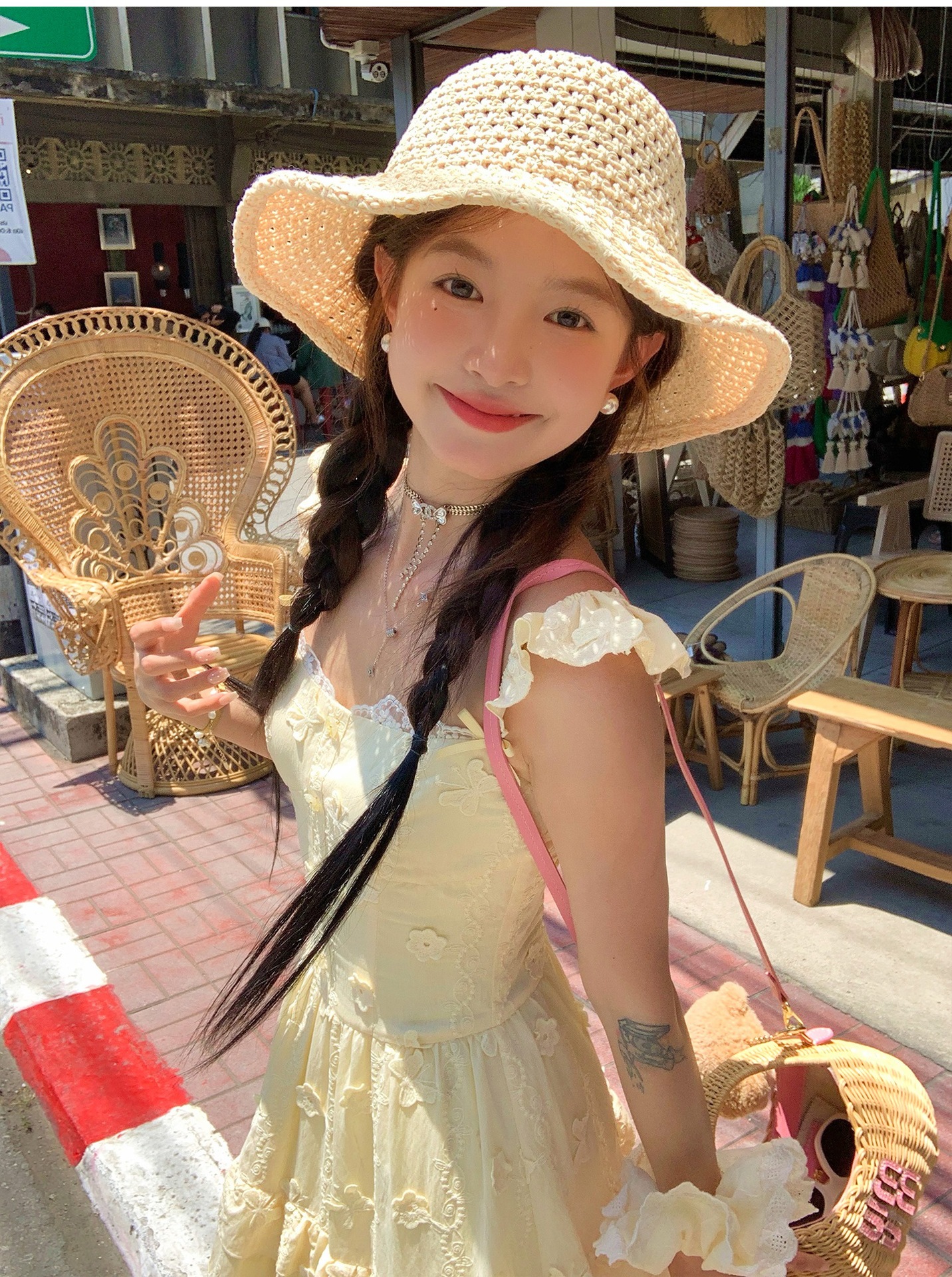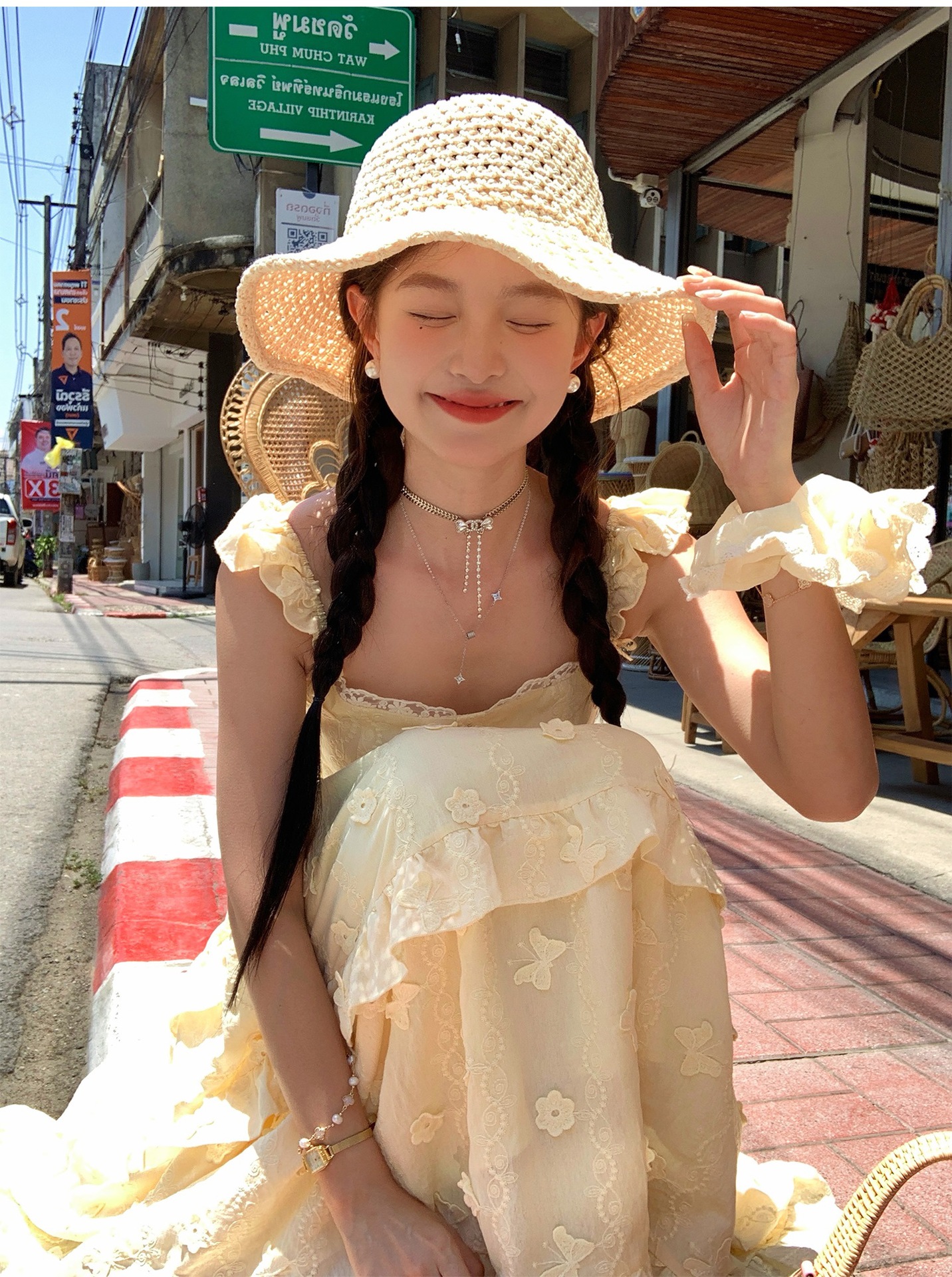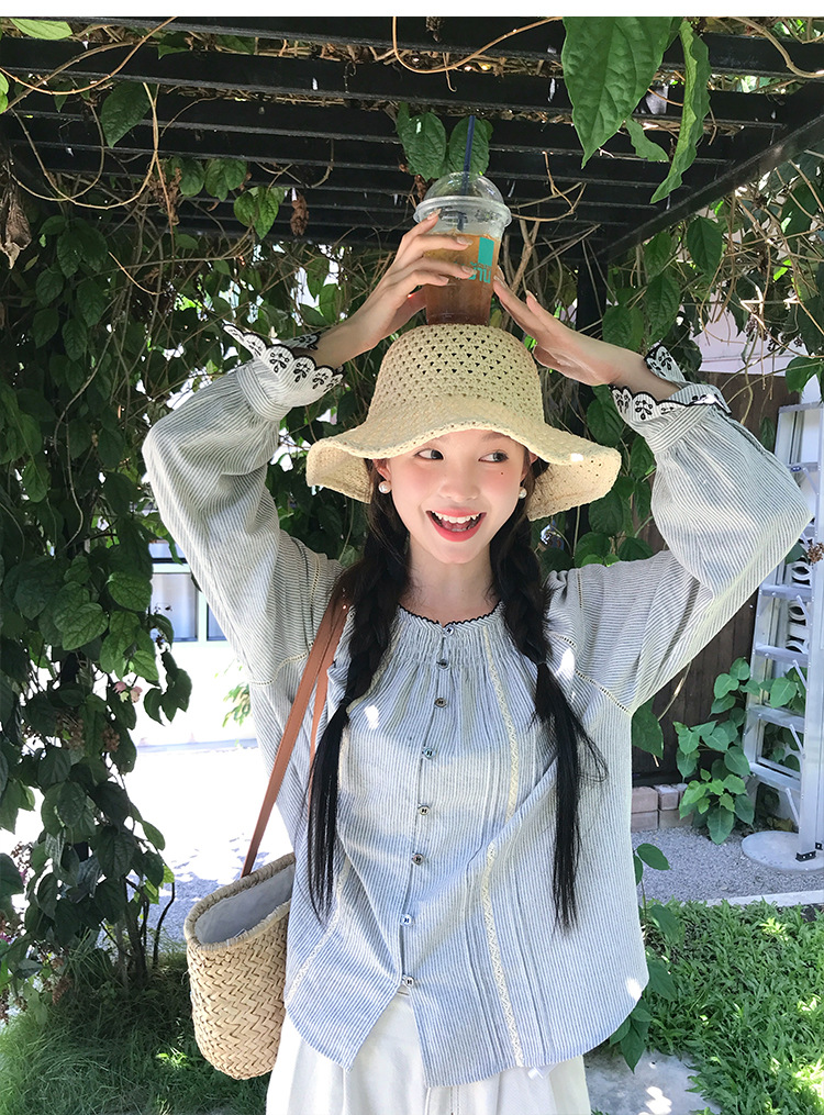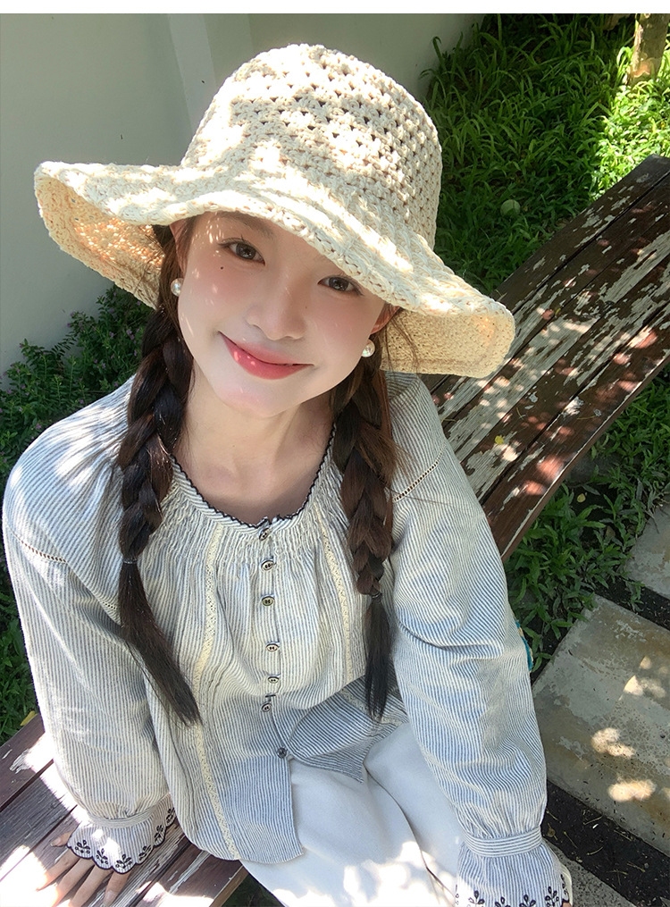 『拉菲草』ins手編み平頂麦わら帽子子供2025新作夏日焼け止め透かし彫り優雅礼帽