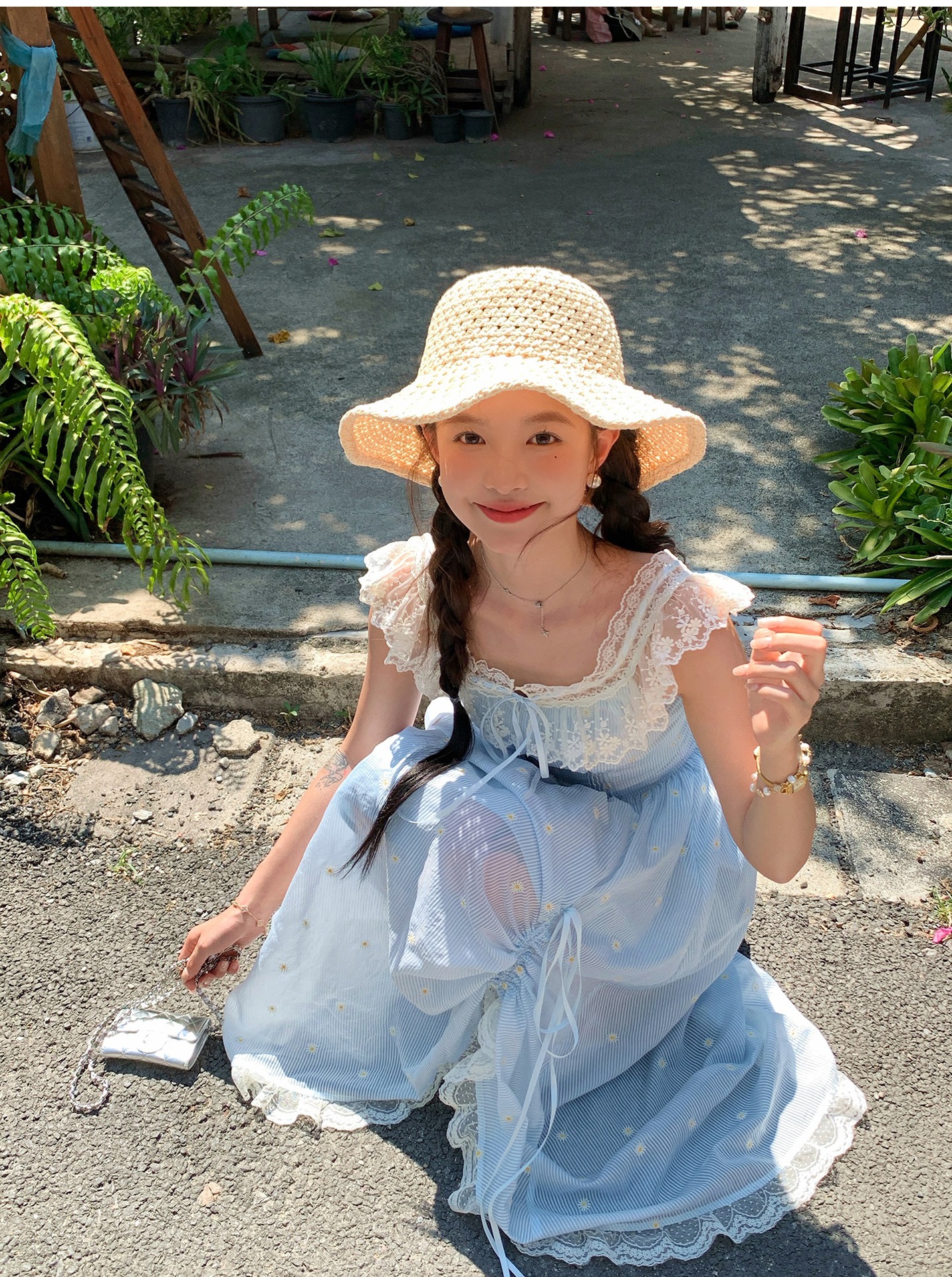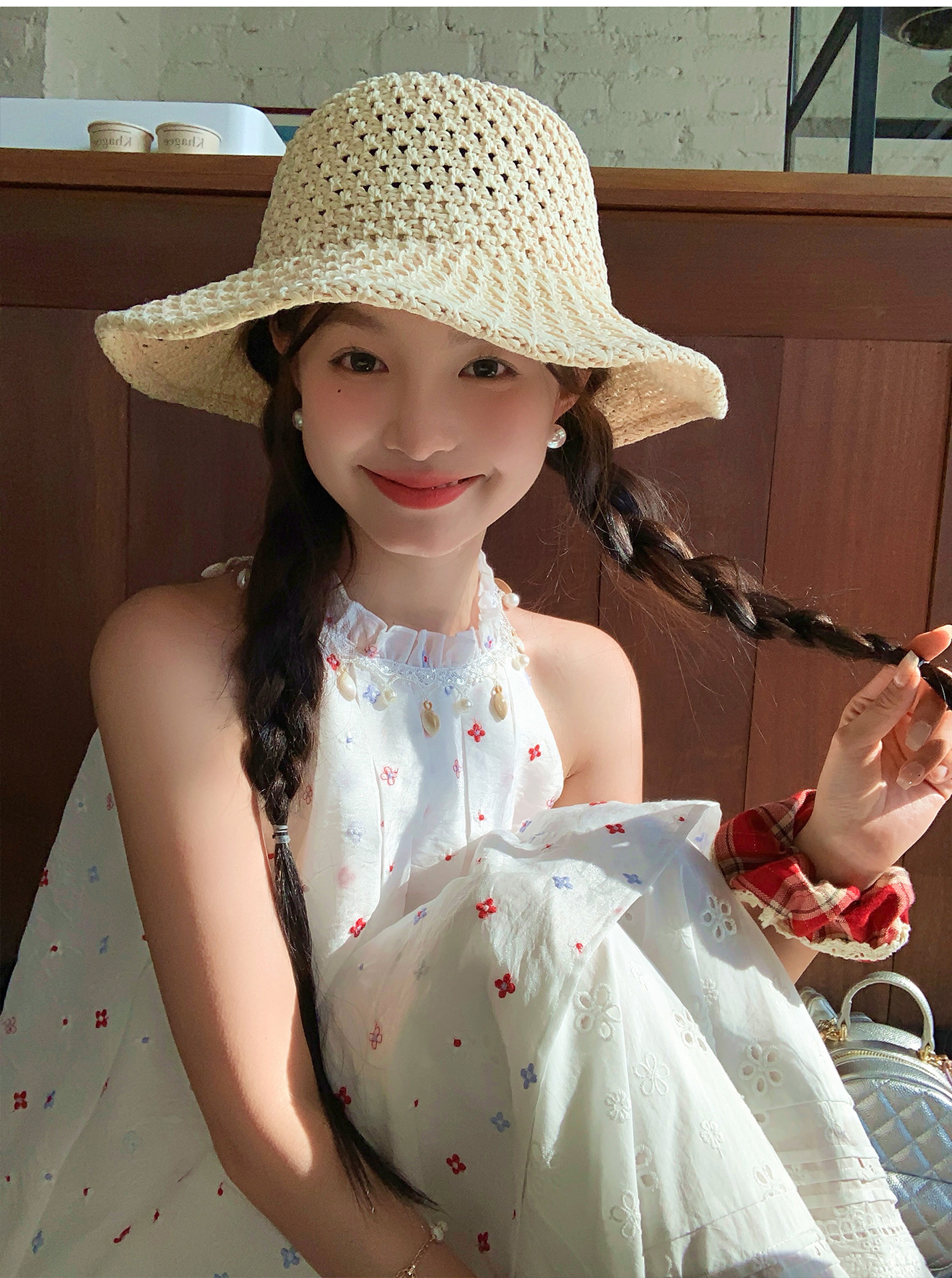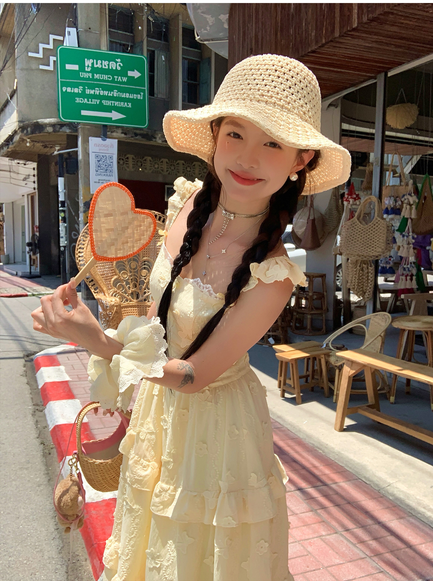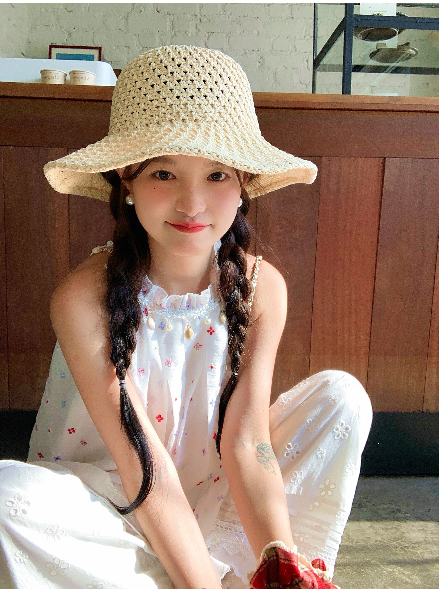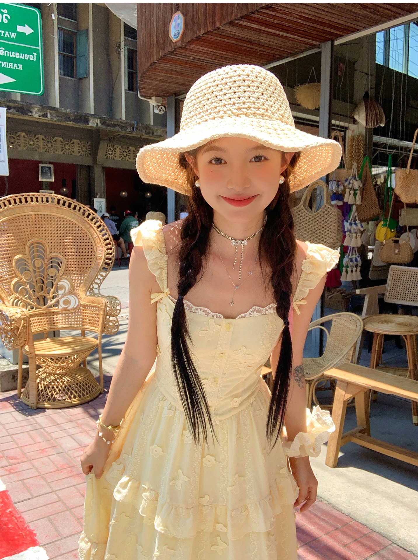 『拉菲草』ins手編み平頂麦わら帽子子供2025新作夏日焼け止め透かし彫り優雅礼帽