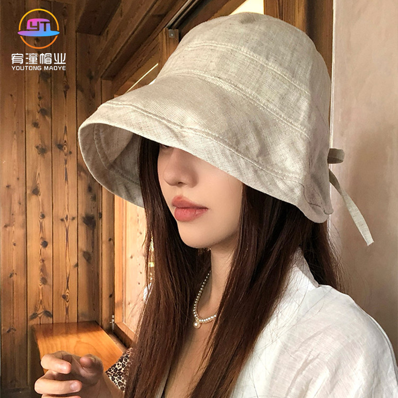 日系亚麻透气渔夫帽纯色女新款春夏轻薄透气显脸小水桶帽百搭盆帽
