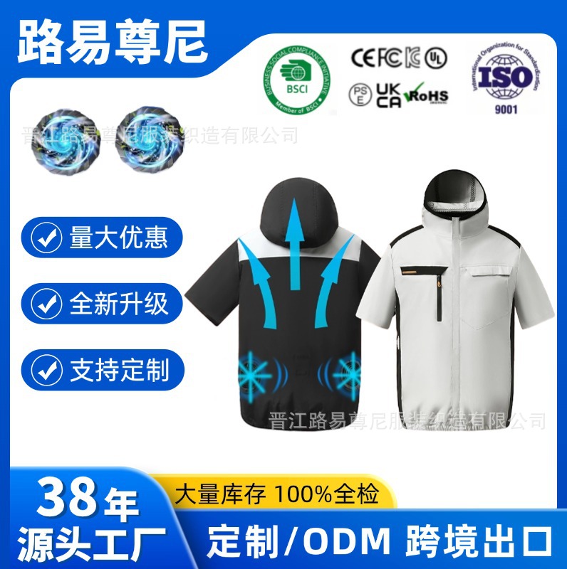 夏季跨境新款空调服防暑工作服短袖制冷降温风扇服连帽工装户外男