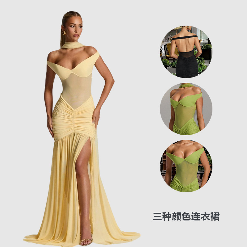 ヨーロッパとアメリカのアマゾンクロスボーダー2025夏対外貿易オフショルダードレススリムフィットスプライシングフィッシュテールロングスカート