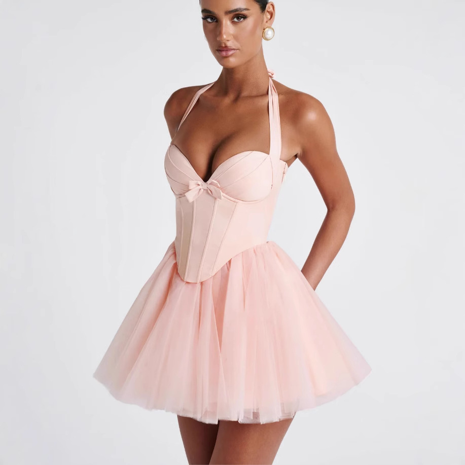 2025新商品欧米の越境気質ファッション街頭修身蓬蓬のスカートは首を掛けて蝶結びのワンピースの女性を結びます。